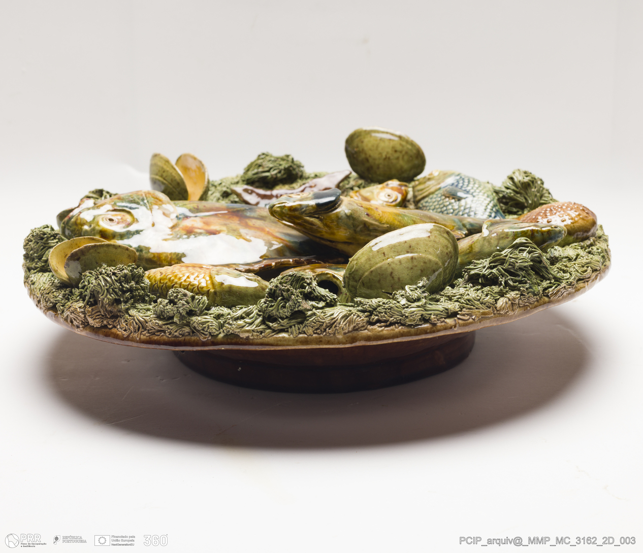 Matéria/Técnica: Barro branco moldado e modelado. Musgados. Vidrado polícromo: castanho escuro e mel, azul, verde, amarelo e camurça; Cronologia: 1870-1887; Autoria: Manuel Cipriano Gomes Mafra / Fábrica De Manuel Cipriano Gomes Mafra, Caldas da Rainha, Portugal; Dimensões (cm): Altura: 9,5; Diâmetro: 31,5.