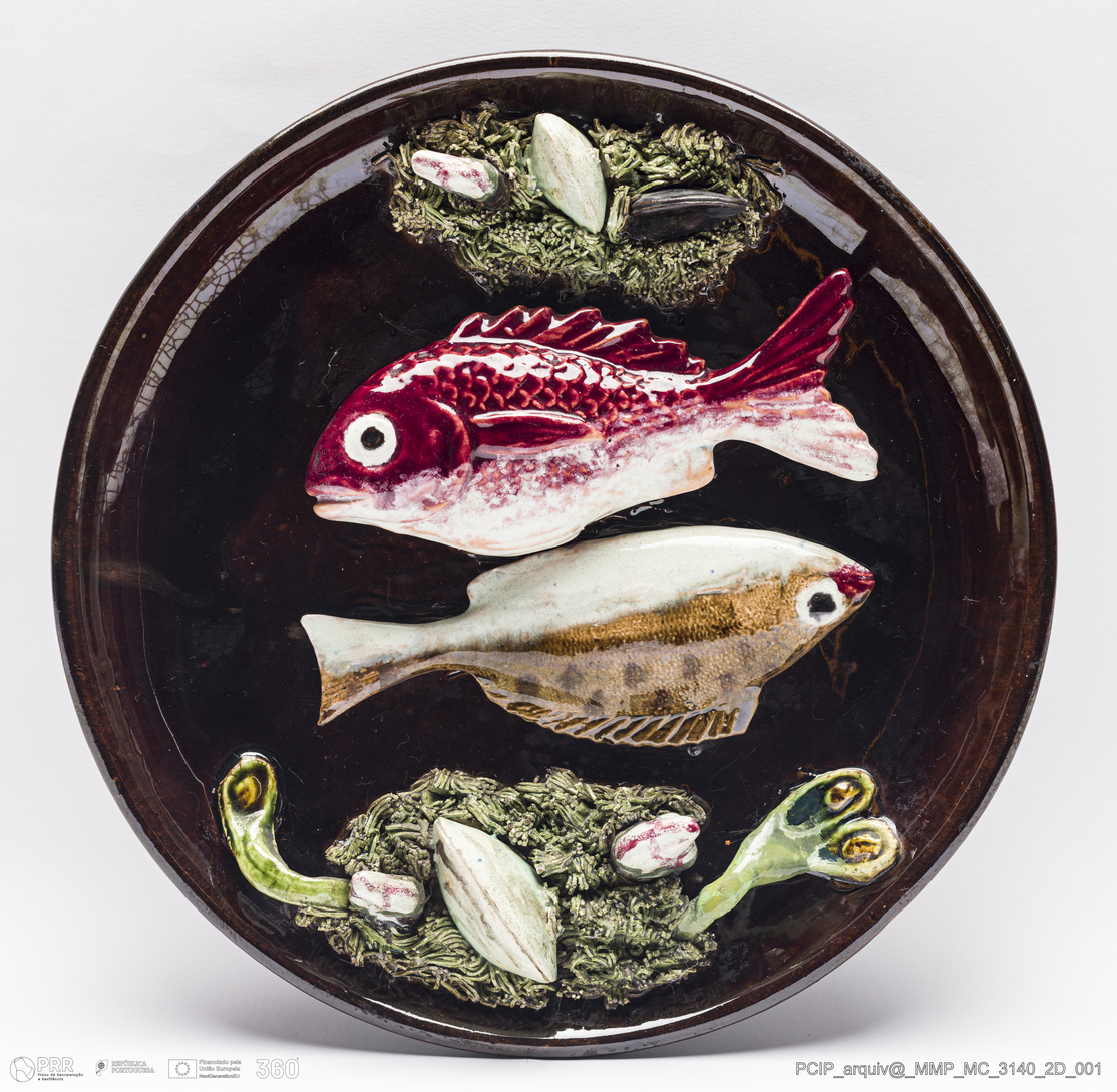 Matéria/Técnica: Barro rodado e moldado. Vidrado polícromo sobre fundo castanho; Cronologia: 1890-1964; Autoria: Aires Constantino Leal / Oficina de Aires Leal, Caldas da Rainha, Portugal; Dimensões (cm): Altura: 4,5; Diâmetro: 21.