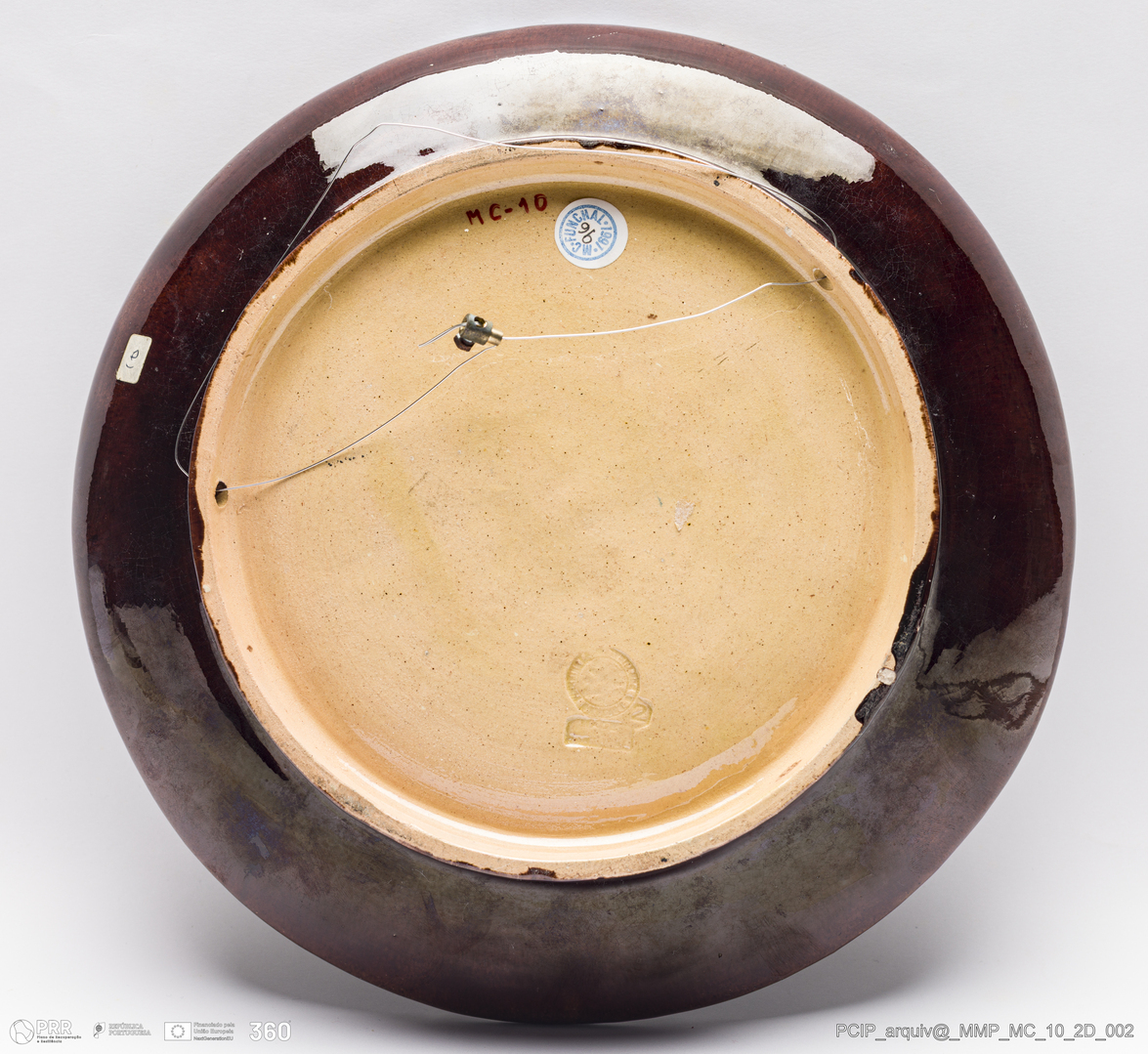 Matéria/Técnica: Barro branco rodado e moldado. Vidrado polícromo: preto, castanho escuro e mel, verde, azul, vermelho amarelo e camurça; Cronologia: 1908; Autoria: Rafael Bordalo Pinheiro / Fábrica de Faianças das Caldas da Rainha, Portugal; Dimensões (cm): Altura: 6; Diâmetro: 26,5.
