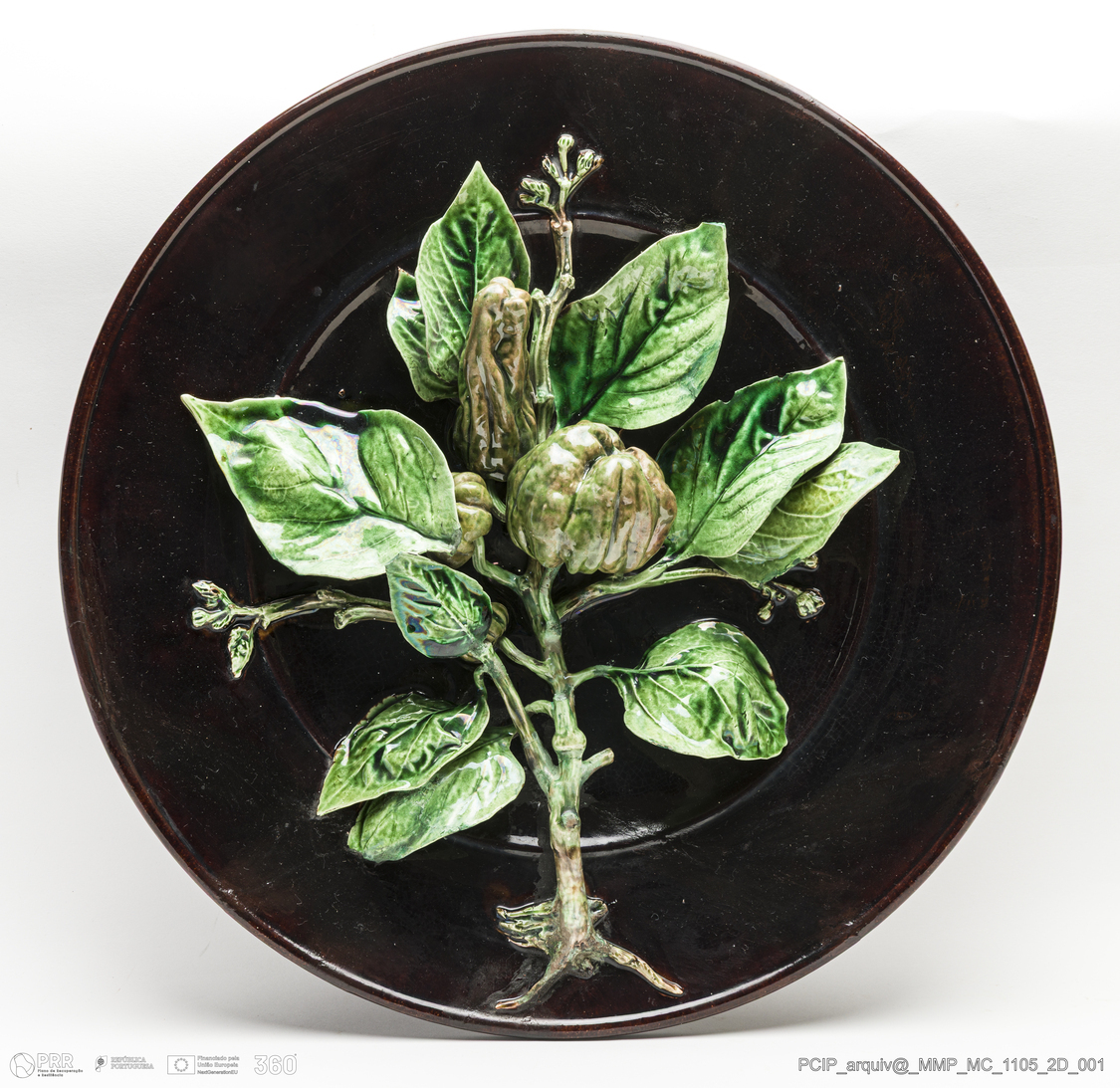 Matéria/Técnica: Barro rodado e moldado. Vidrado polícromo: verde de cobre e castanho de manganês irisado; Cronologia: 1907-1913; Autoria: António Augusto da Costa Motta / Fábrica De Faianças das Caldas da Rainha, Portugal; Dimensões (cm): Altura: 5; Diâmetro: 39,5.