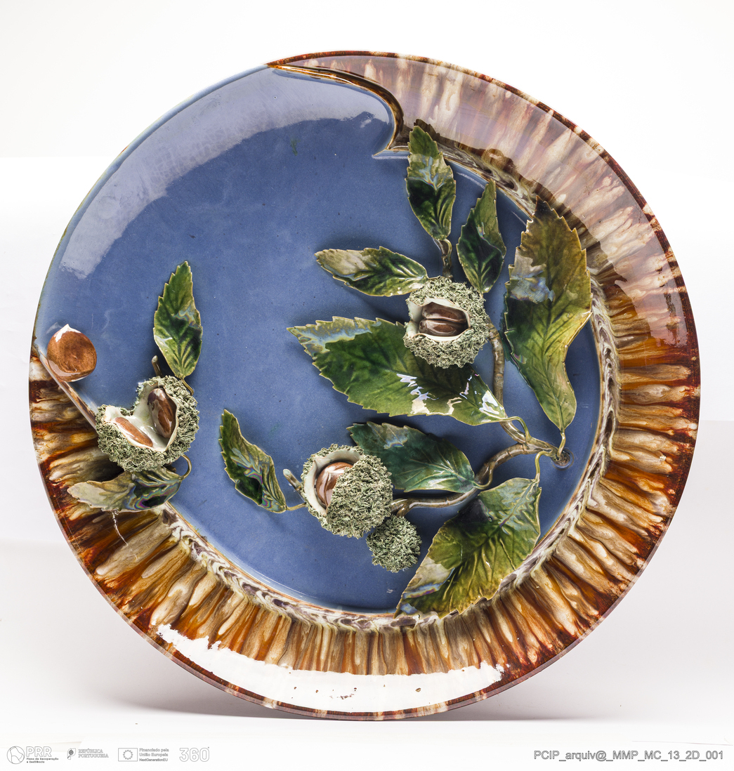 Matéria/Técnica: Barro vermelho rodado e moldado. Vidrado polícromo: castanho escuro e mel, azul e verde; aba parcialmente com escorridos em tons de castanhos; Cronologia: 1900; Autoria: Rafael Bordalo Pinheiro / Fábrica de Faianças das Caldas da Rainha, Portugal; Dimensões (cm): Altura: 8; Diâmetro: 45.