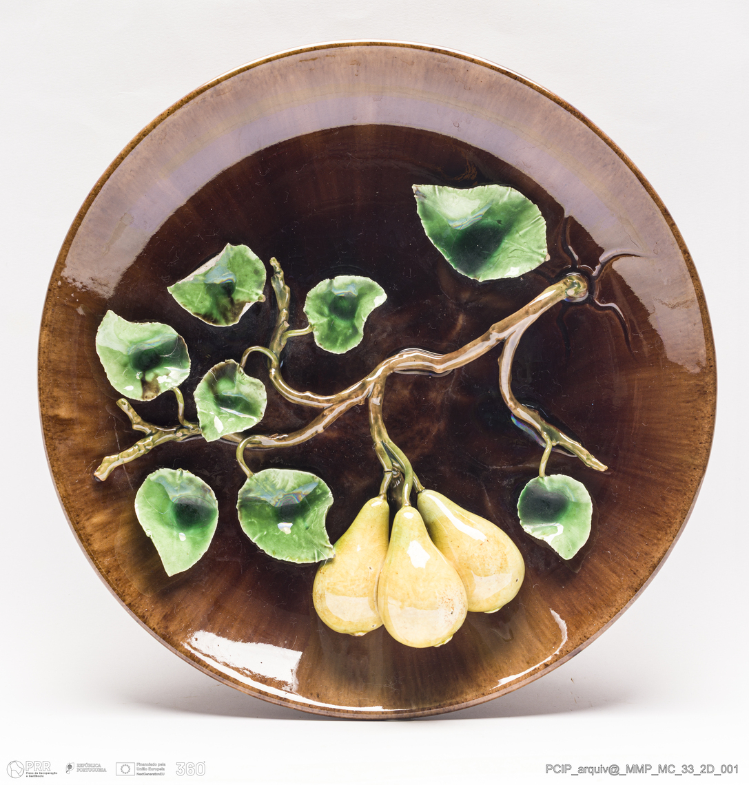 Matéria/Técnica: Barro vermelho rodado e moldado e modelado. Vidrado polícromo: castanho escuro e mel, verde e amarelo; Cronologia: 1900; Autoria: Rafael Bordalo Pinheiro / Fábrica de Faianças das Caldas da Rainha, Portugal; Dimensões (cm): Altura: 6; Diâmetro: 28.