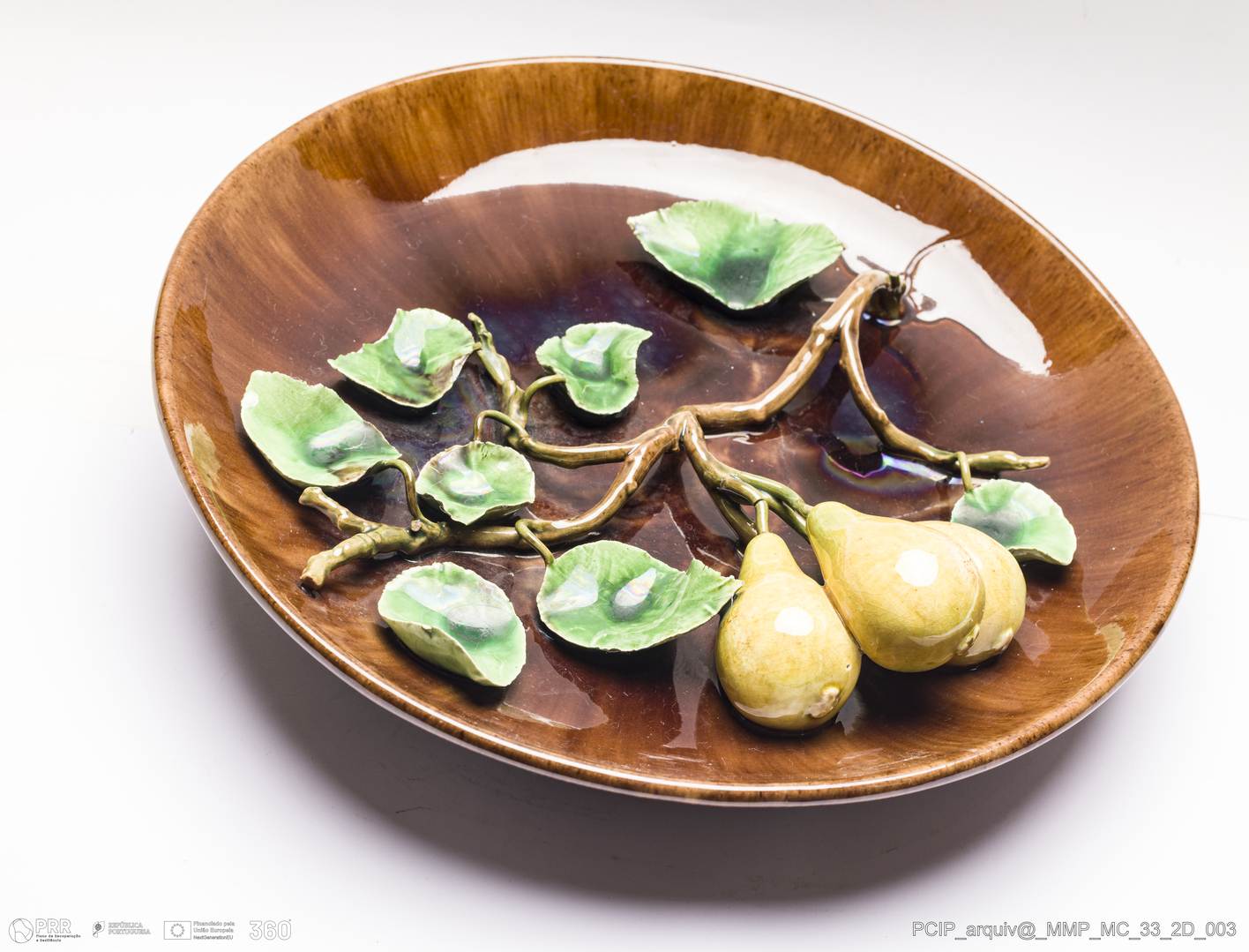 Matéria/Técnica: Barro vermelho rodado e moldado e modelado. Vidrado polícromo: castanho escuro e mel, verde e amarelo; Cronologia: 1900; Autoria: Rafael Bordalo Pinheiro / Fábrica de Faianças das Caldas da Rainha, Portugal; Dimensões (cm): Altura: 6; Diâmetro: 28.