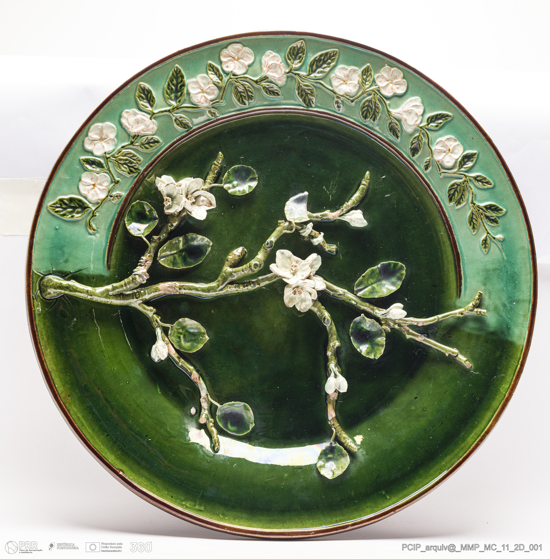 Matéria/Técnica: Barro vermelho rodado e moldado. Vidrado polícromo: preto, castanho escuro, verde, rosa e branco; Cronologia: 1902; Autoria: Rafael Bordalo Pinheiro / Fábrica de Faianças das Caldas da Rainha, Portugal; Dimensões (cm): Altura: 6; Diâmetro: 42.