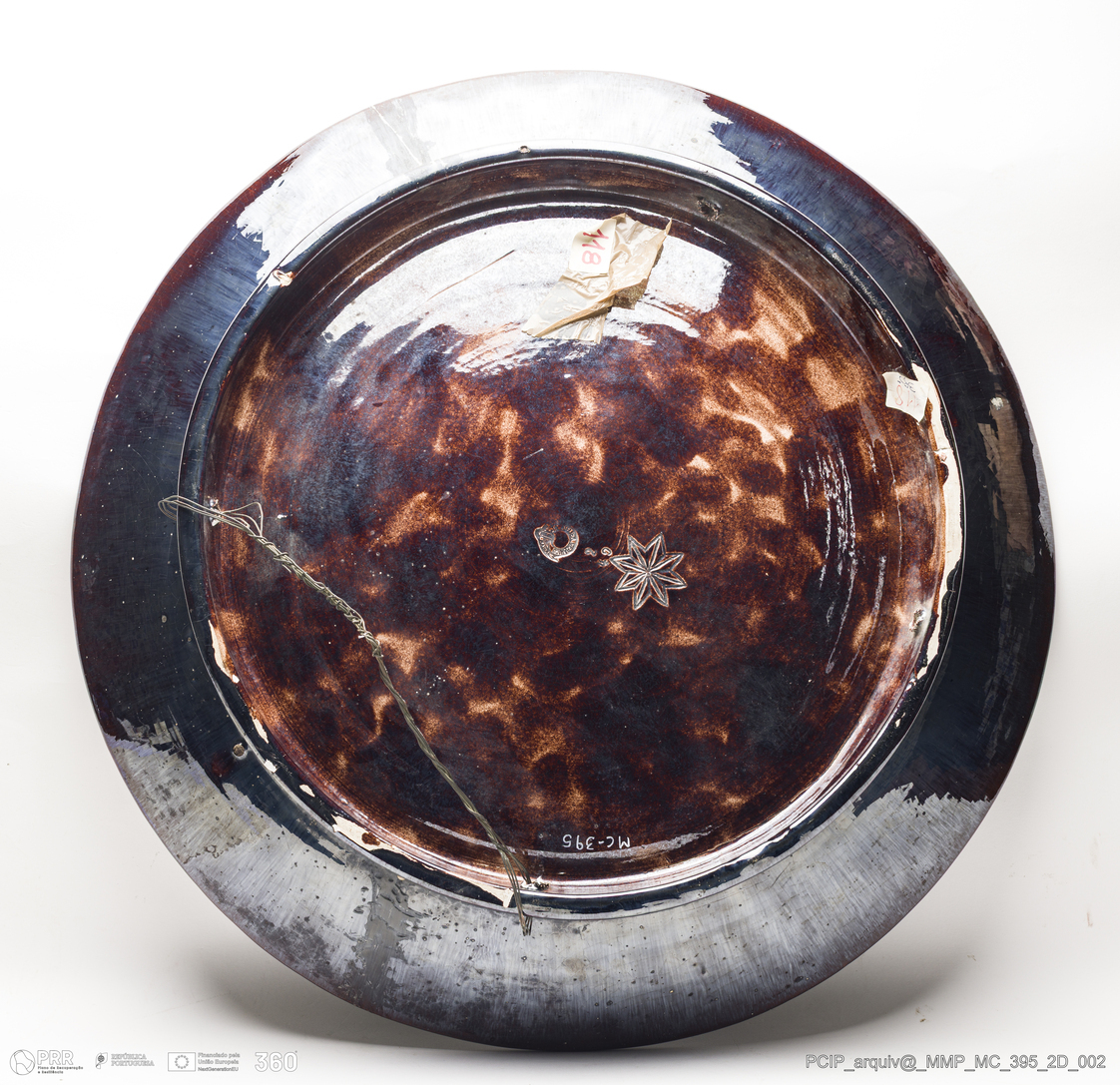 Matéria/Técnica: Barro vermelho rodado, moldado e modelado. Vidrado polícromo: verde cobre, castanho de manganês, branco estanho, beje e azul cobalto; Cronologia: 1893; Autoria: Desconhecido / Atelier Cerâmico, Caldas da Rainha, Portugal; Dimensões (cm): Altura: 10; Diâmetro: 60.