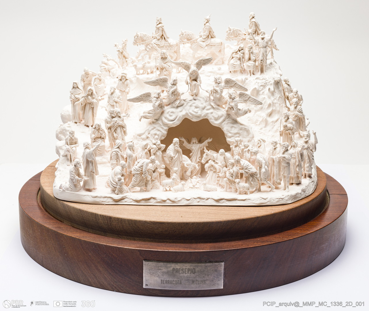 Matéria/Técnica: Barro branco modelado, sobre base de madeira; Cronologia: 1986; Autoria: Francisco Elias / Caldas da Rainha, Portugal; Dimensões (cm): Altura: 19; Largura: 28; Comprimento: 21; Com base e vidro Altura: 36; Diâmetro: 36.