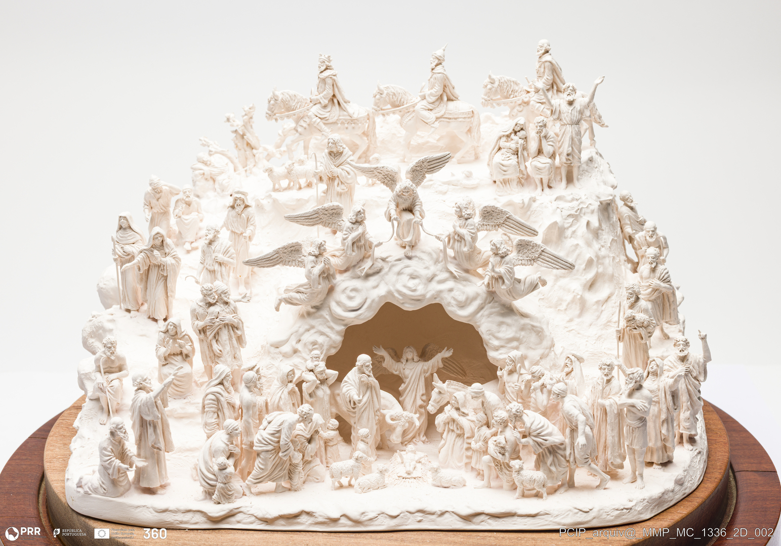 Matéria/Técnica: Barro branco modelado, sobre base de madeira; Cronologia: 1986; Autoria: Francisco Elias / Caldas da Rainha, Portugal; Dimensões (cm): Altura: 19; Largura: 28; Comprimento: 21; Com base e vidro Altura: 36; Diâmetro: 36.