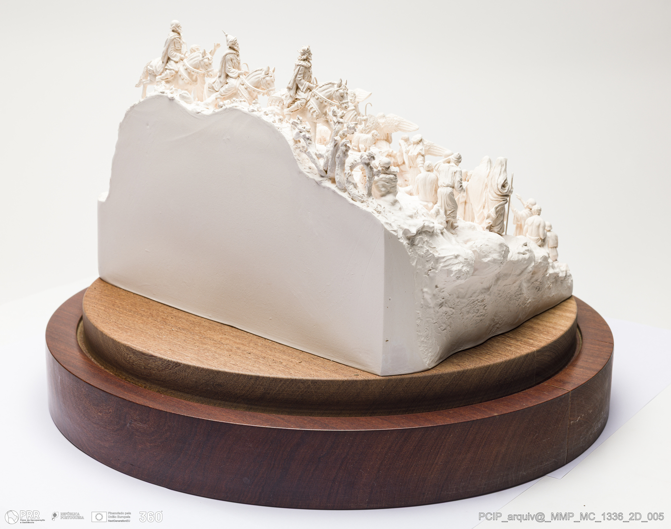 Matéria/Técnica: Barro branco modelado, sobre base de madeira; Cronologia: 1986; Autoria: Francisco Elias / Caldas da Rainha, Portugal; Dimensões (cm): Altura: 19; Largura: 28; Comprimento: 21; Com base e vidro Altura: 36; Diâmetro: 36.