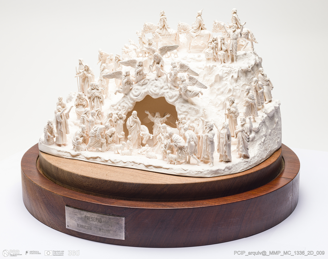 Matéria/Técnica: Barro branco modelado, sobre base de madeira; Cronologia: 1986; Autoria: Francisco Elias / Caldas da Rainha, Portugal; Dimensões (cm): Altura: 19; Largura: 28; Comprimento: 21; Com base e vidro Altura: 36; Diâmetro: 36.