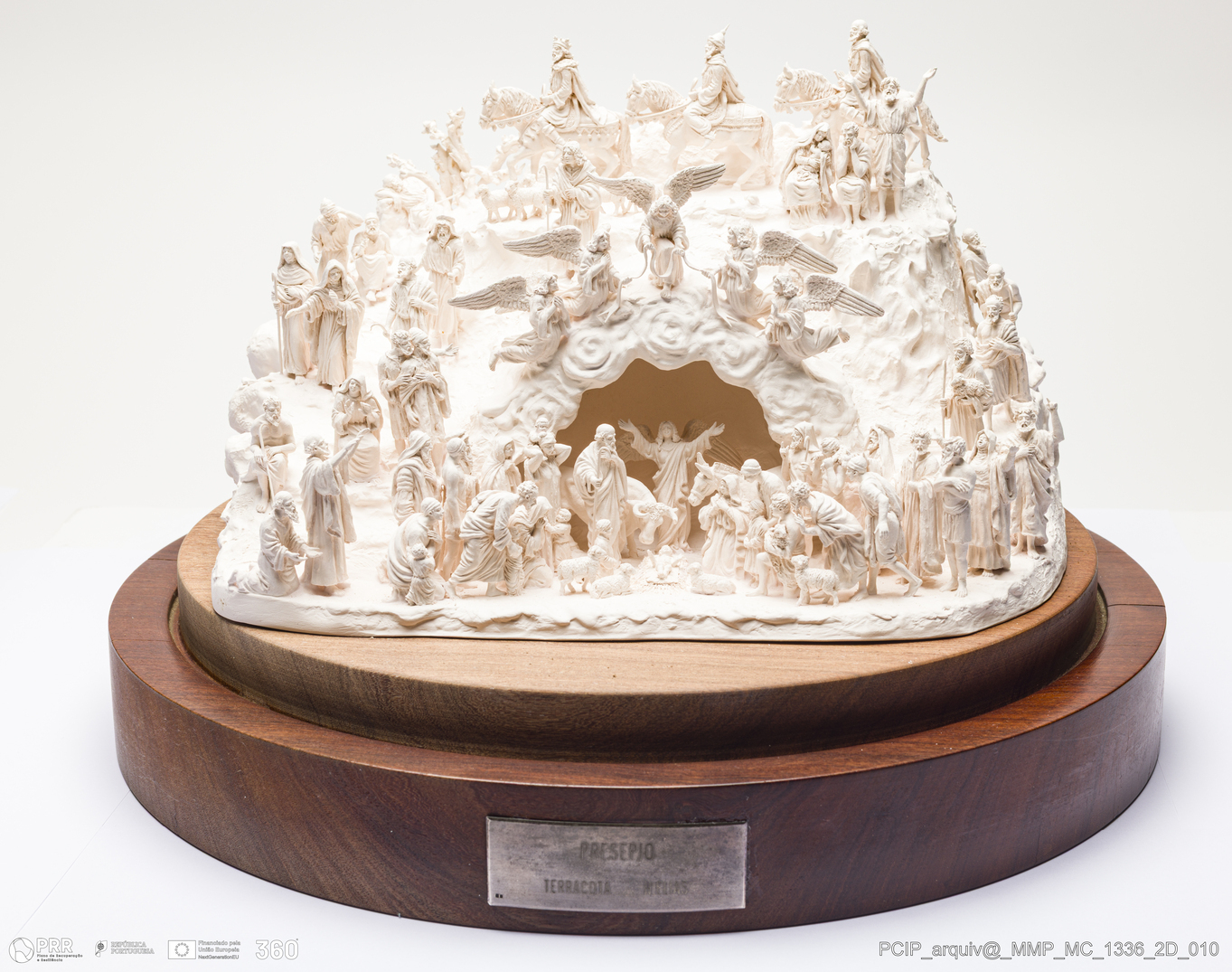 Matéria/Técnica: Barro branco modelado, sobre base de madeira; Cronologia: 1986; Autoria: Francisco Elias / Caldas da Rainha, Portugal; Dimensões (cm): Altura: 19; Largura: 28; Comprimento: 21; Com base e vidro Altura: 36; Diâmetro: 36.