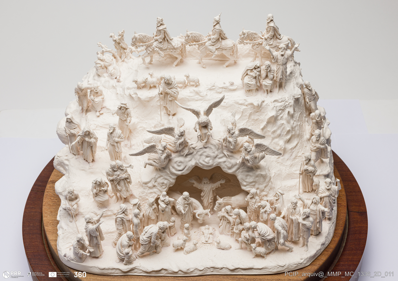 Matéria/Técnica: Barro branco modelado, sobre base de madeira; Cronologia: 1986; Autoria: Francisco Elias / Caldas da Rainha, Portugal; Dimensões (cm): Altura: 19; Largura: 28; Comprimento: 21; Com base e vidro Altura: 36; Diâmetro: 36.
