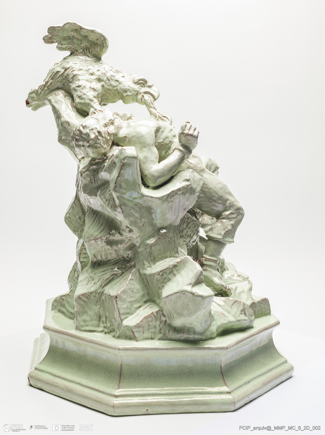Matéria/Técnica: Barro vermelho moldado. Vidrado branco; Cronologia: 1892-1895; Autoria: Rafael Bordalo Pinheiro / Fábrica de Faianças das Caldas da Rainha, Portugal; Dimensões (cm): Altura: 48; Largura: 37; Comprimento: 30.