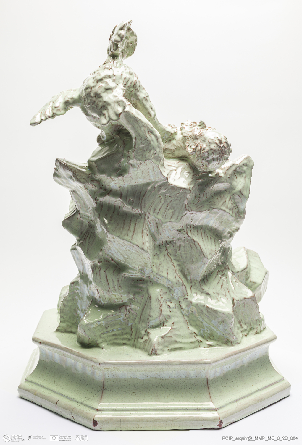 Matéria/Técnica: Barro vermelho moldado. Vidrado branco; Cronologia: 1892-1895; Autoria: Rafael Bordalo Pinheiro / Fábrica de Faianças das Caldas da Rainha, Portugal; Dimensões (cm): Altura: 48; Largura: 37; Comprimento: 30.