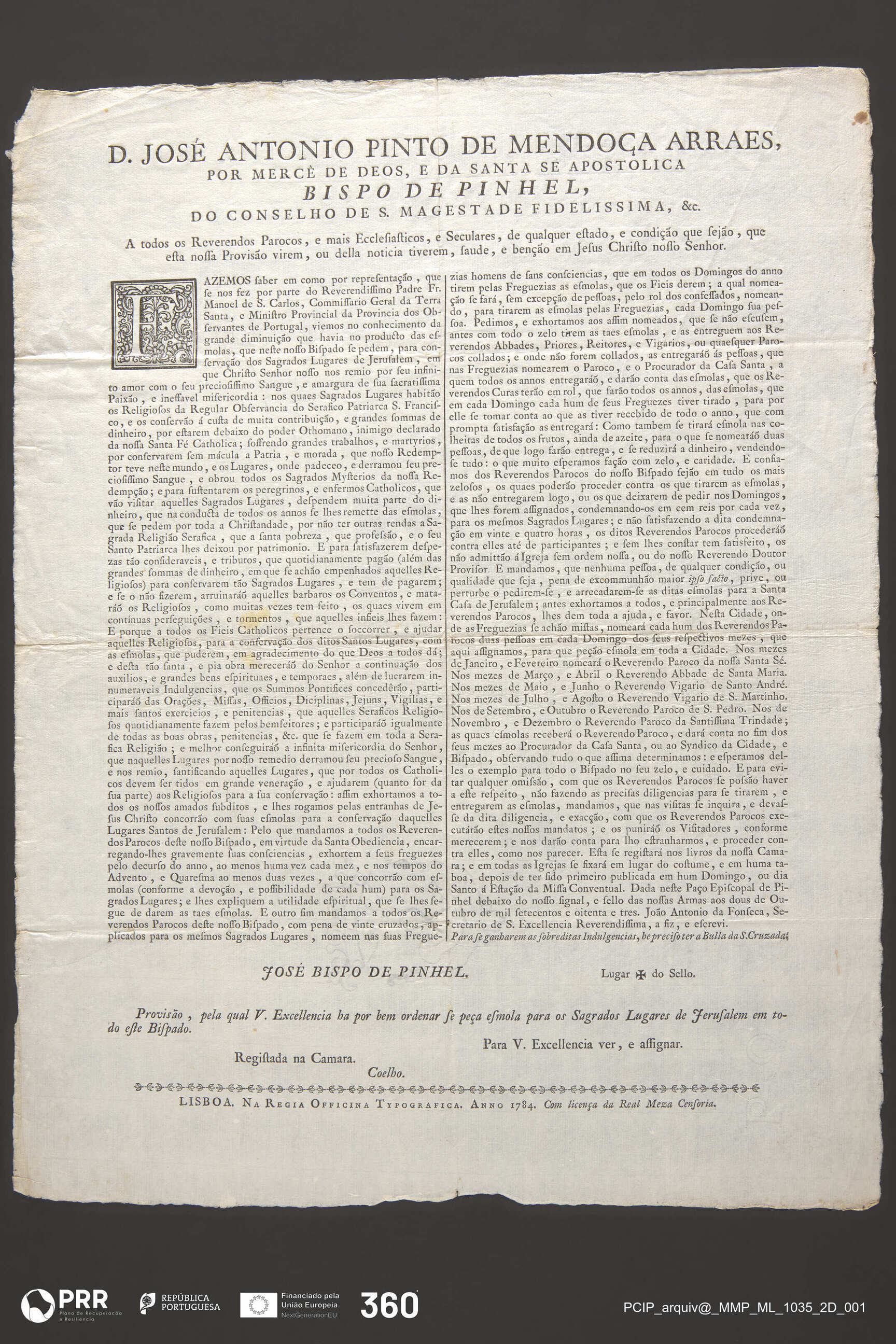 Matéria/Técnica: Impressão; Cronologia: 1784; Autoria: Arraes, D. José António Pinto de Mendonça - Bispo de Pinhel; Fonseca, João António da - Secretário do Bispo de Pinhel; Dimensões (cm): Altura: 47 x Largura: 36.