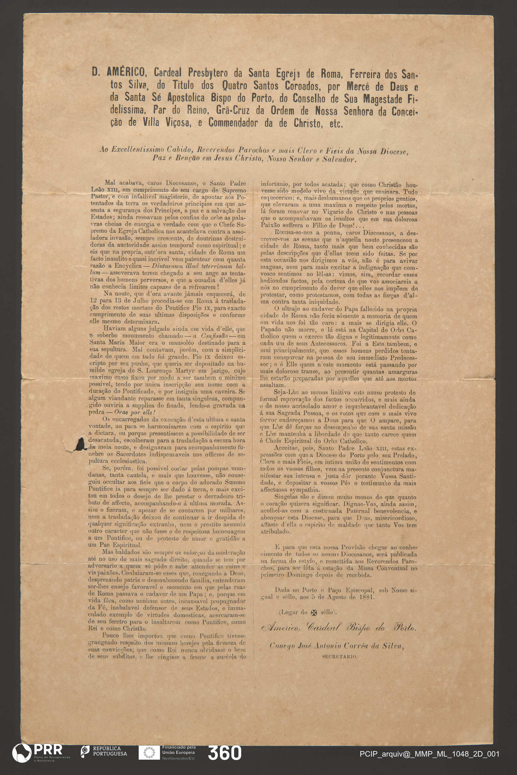 Matéria/Técnica: Impressão; Cronologia: 1881; Autoria: D. Américo, Cardeal e Bispo do Porto; Dimensões (cm): Altura: 40 x Largura: 25,5.