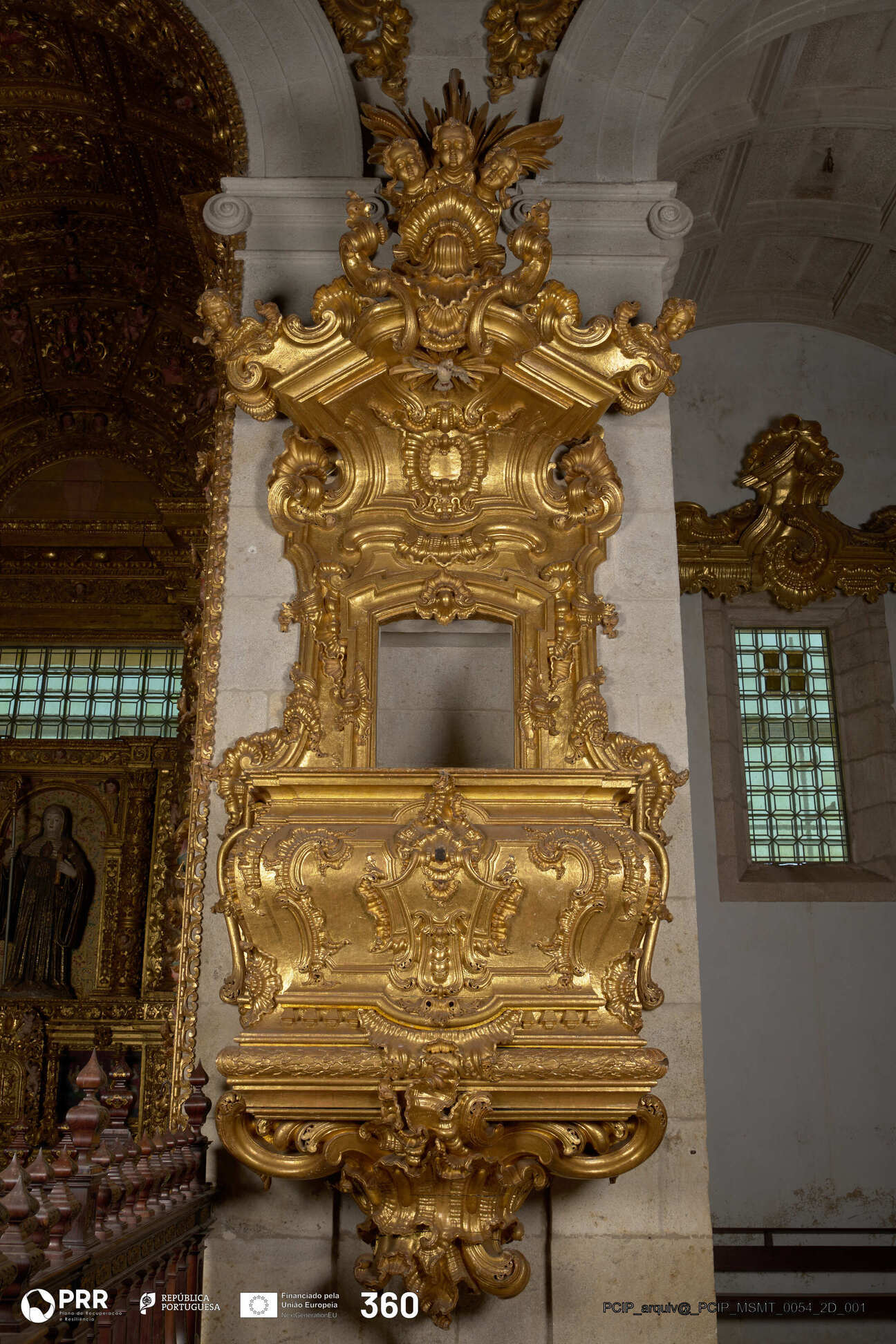 Matéria/Técnica: Madeira entalhada e dourada / Entalhamento e douramento; Cronologia: 1757 - 1758; Autoria: André Soares; Dimensões (cm): 532 x 220 x 102.