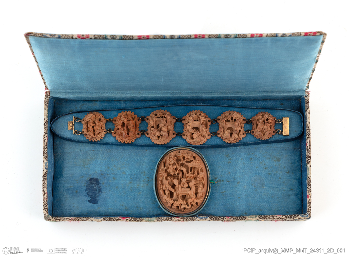 Matéria/Técnica: Metal dourado; madeira; Cronologia: 1880 - 1900; Autoria: Desconhecida; Dimensões (cm): Pulseira: Altura: 3 cm; Comprimento: 19,2 cm; Alfinete: Altura: 5,5 cm; Largura: 4,5 cm; Brincos: Altura: 2; Espigão: 2,7; Largura: 1,5.