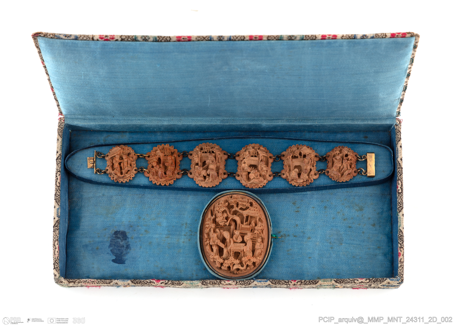 Matéria/Técnica: Metal dourado; madeira; Cronologia: 1880 - 1900; Autoria: Desconhecida; Dimensões (cm): Pulseira: Altura: 3 cm; Comprimento: 19,2 cm; Alfinete: Altura: 5,5 cm; Largura: 4,5 cm; Brincos: Altura: 2; Espigão: 2,7; Largura: 1,5.