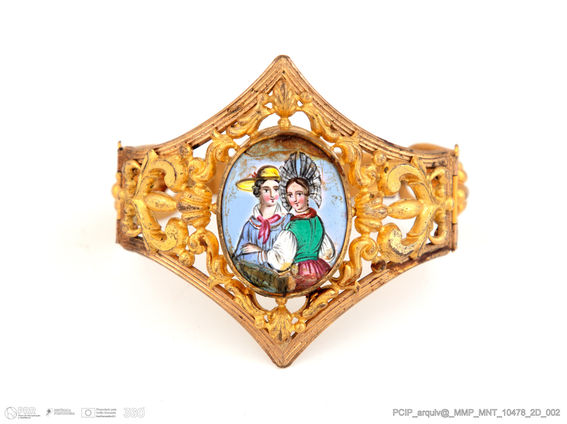 Matéria/Técnica: Metal dourado; esmalte.; Cronologia: 1ª metade do século XIX; Autoria: Desconhecida; Dimensões (cm): Largura: 5,8 cm; Comprimento: 9 cm; Peso 22g .