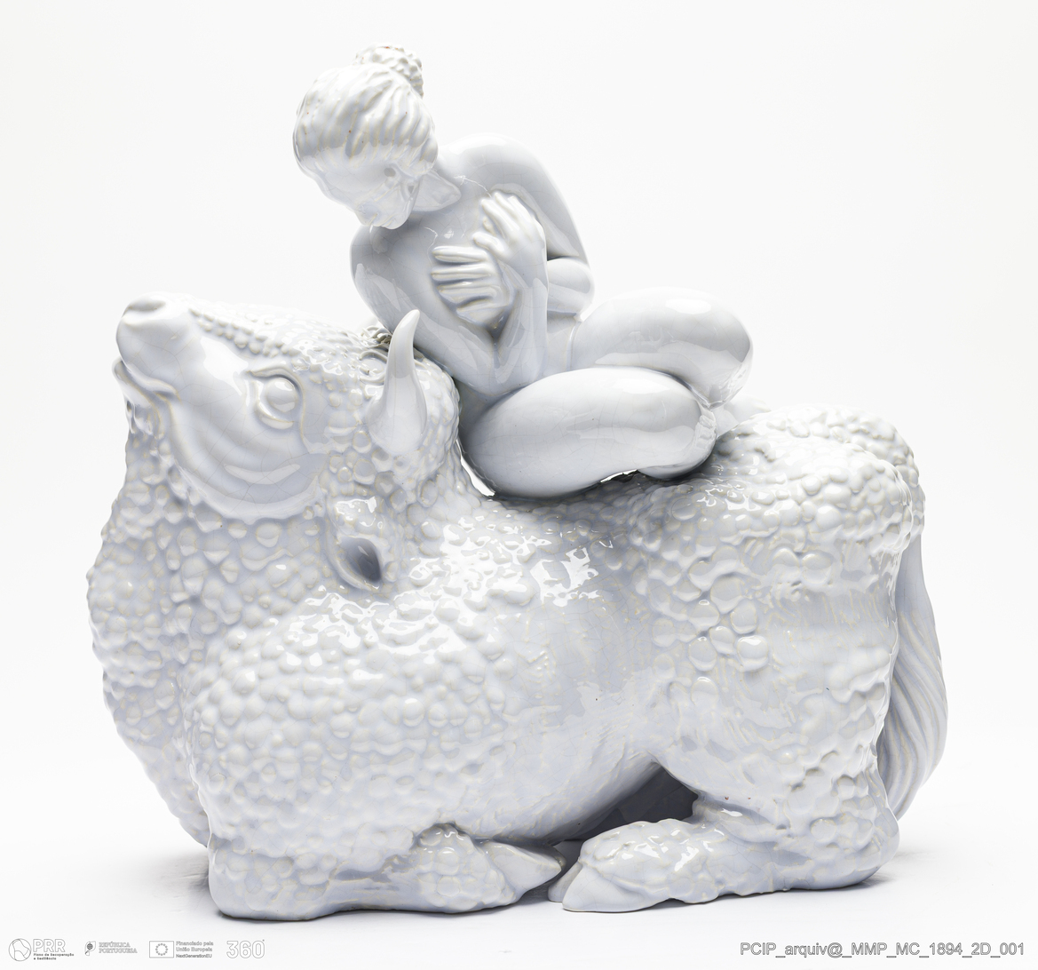 Matéria/Técnica: Pasta de faiança feldspática moldada. Vidrado branco opaco; Cronologia: 1954; Autoria: Fernando Ponte e Sousa / Fábrica Secla, Caldas da Rainha, Portugal; Dimensões (cm): Altura: 28; Largura: 28; Comprimento: 17.