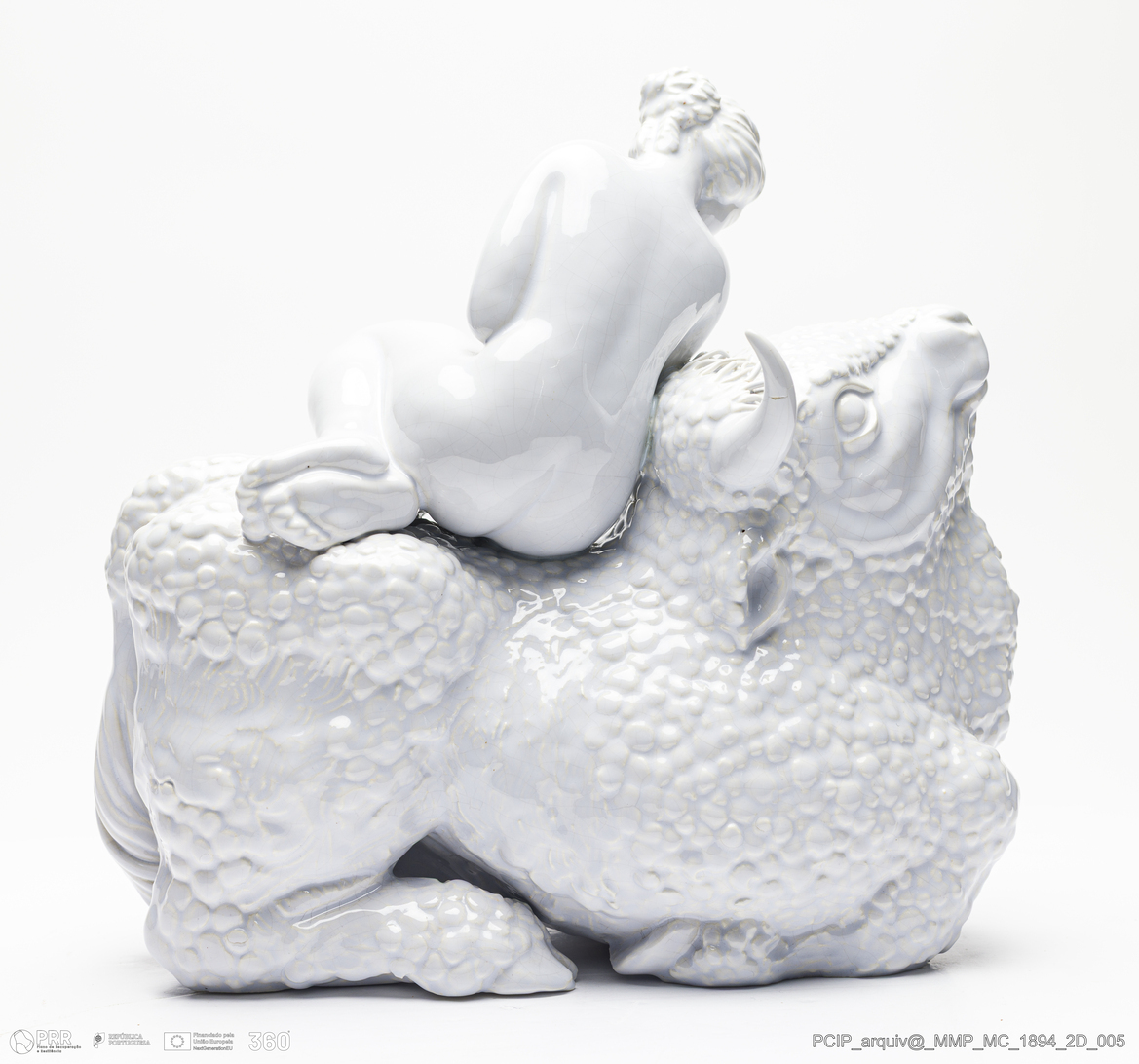 Matéria/Técnica: Pasta de faiança feldspática moldada. Vidrado branco opaco; Cronologia: 1954; Autoria: Fernando Ponte e Sousa / Fábrica Secla, Caldas da Rainha, Portugal; Dimensões (cm): Altura: 28; Largura: 28; Comprimento: 17.