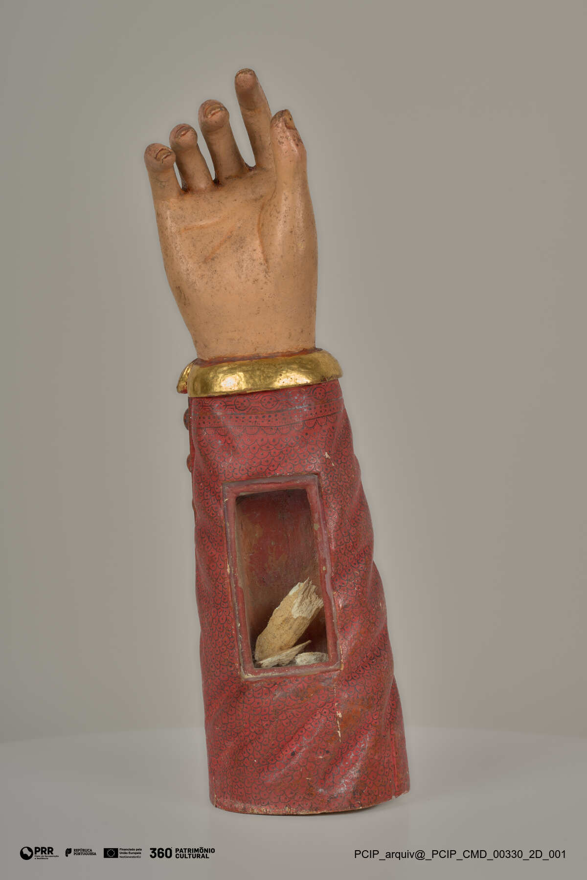 Matéria/Técnica: Madeira, pigmentos, ouro, vidro, osso.; Cronologia: 1664; Autoria: António Lopes; António de Oliveira; Dimensões: Altura: 38 cm; Largura: 10,5 cm; Profundidade: 10 cm.