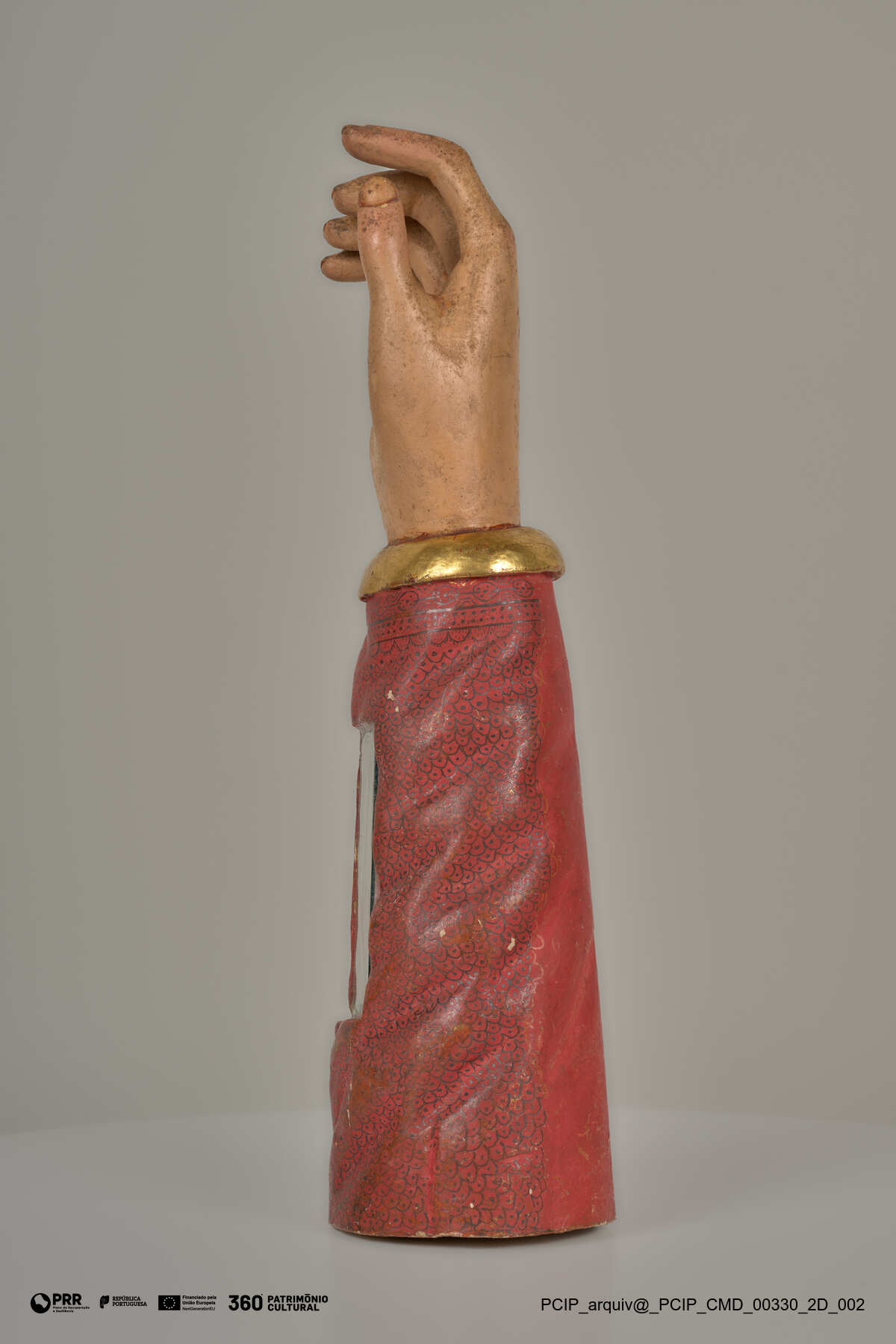 Matéria/Técnica: Madeira, pigmentos, ouro, vidro, osso.; Cronologia: 1664; Autoria: António Lopes; António de Oliveira; Dimensões: Altura: 38 cm; Largura: 10,5 cm; Profundidade: 10 cm.