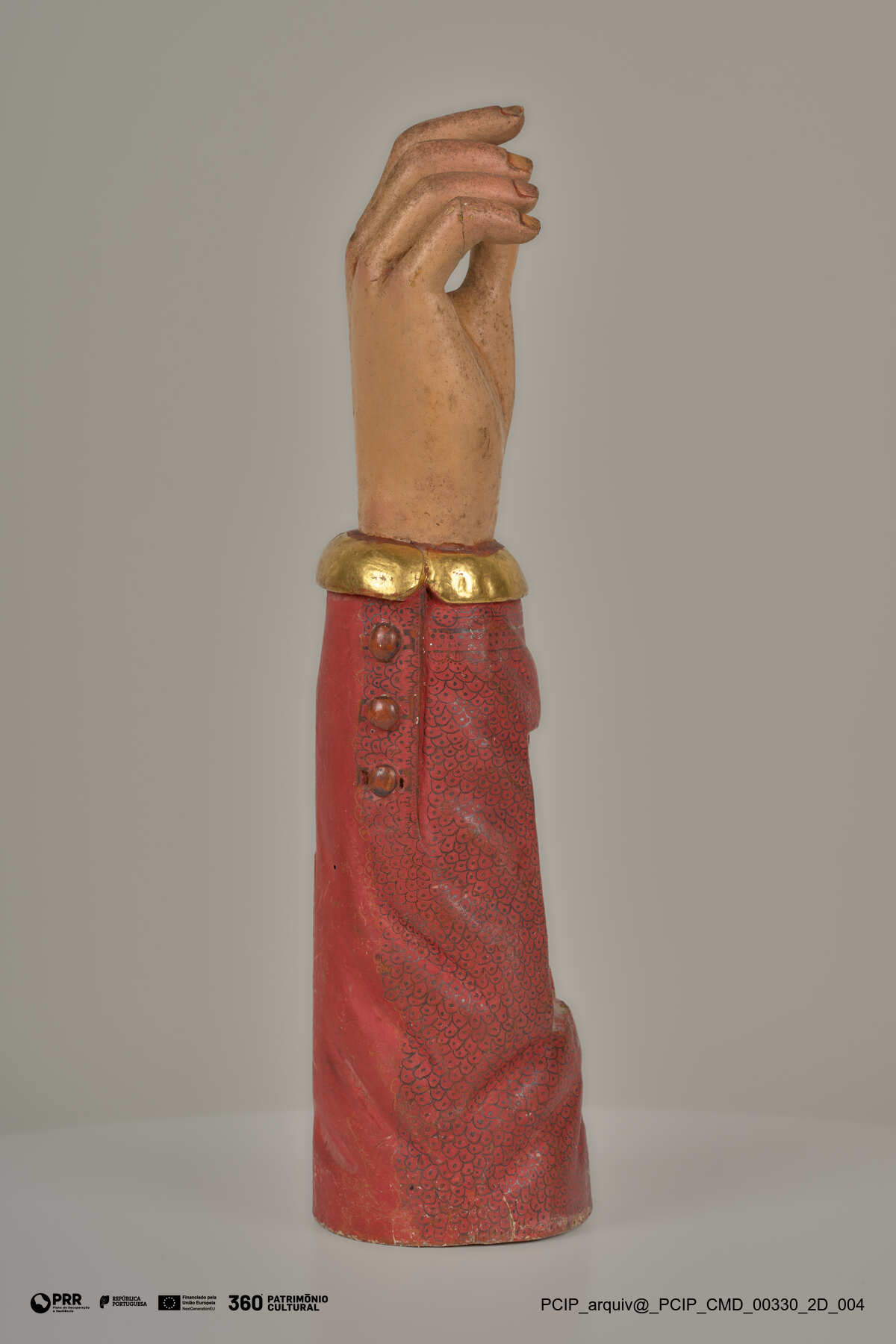 Matéria/Técnica: Madeira, pigmentos, ouro, vidro, osso.; Cronologia: 1664; Autoria: António Lopes; António de Oliveira; Dimensões: Altura: 38 cm; Largura: 10,5 cm; Profundidade: 10 cm.