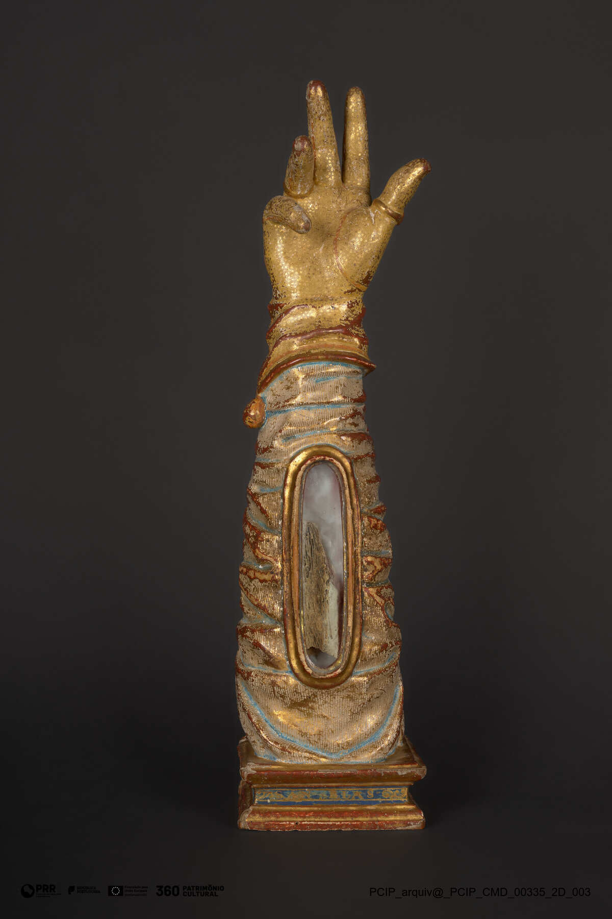 Matéria/Técnica: Madeira, pigmentos, ouro, tecido, vidro, couro.; Cronologia: 1633 - 1637; Autoria: Gregório Fernandéz; Francisco Velasquez; Alonso de Ramessal; Dimensões: Altura: 46 cm; Largura: 12 cm; Profundidade: 10 cm.