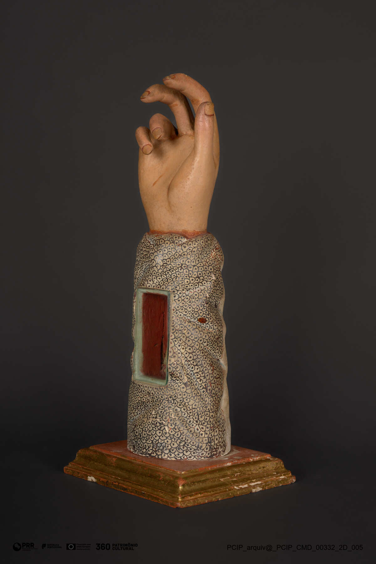 Matéria/Técnica: Madeira, pigmentos, ouro, vidro, osso.; Cronologia: 1664; Autoria: António Lopes; António de Oliveira; Dimensões: Altura: 40 cm; Largura: 18,5 cm; Profundidade: 15,5 cm.