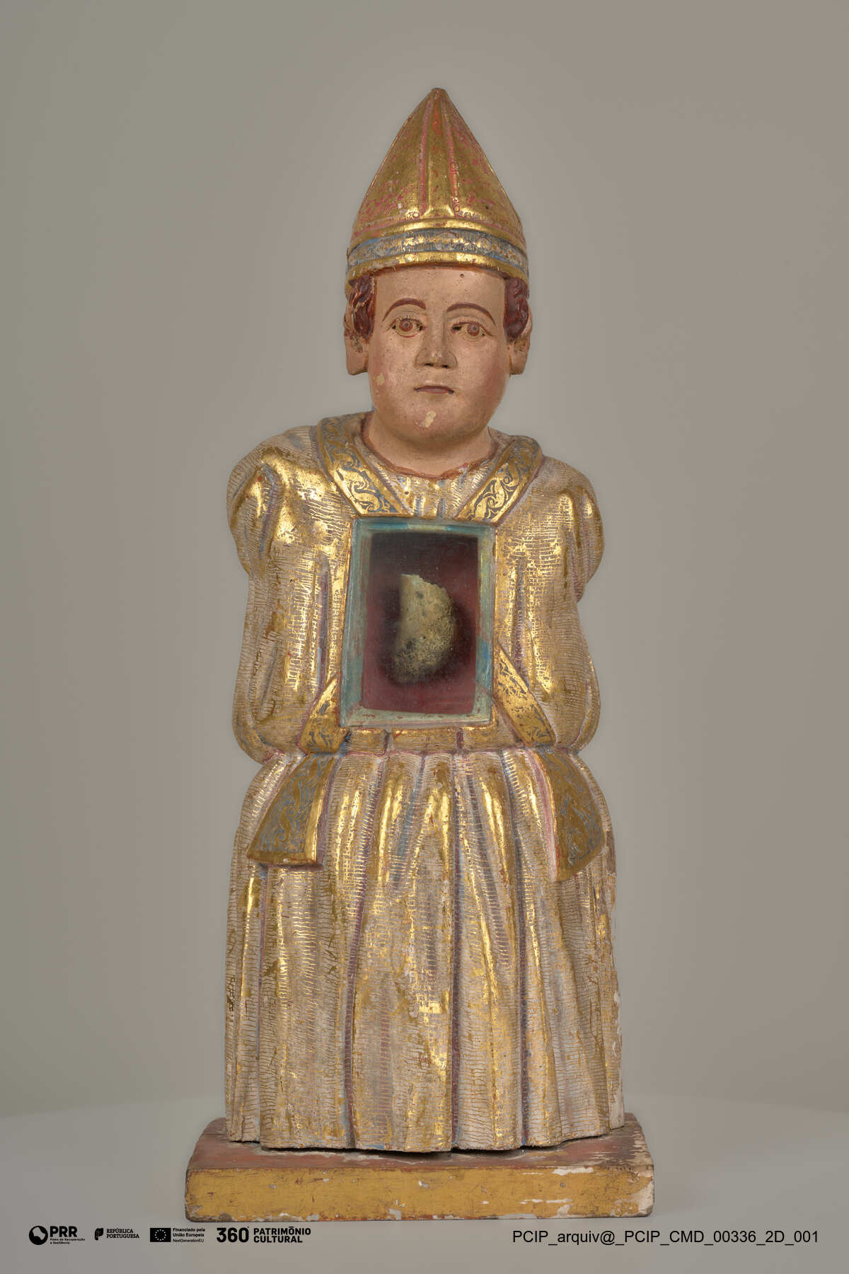 Matéria/Técnica: Madeira, pigmentos, ouro, tecido, vidro, osso.; Cronologia: 1664; Autoria: António Lopes; António de Oliveira; Dimensões: Altura: 48 cm; Largura: 18 cm; Profundidade: 14 cm.