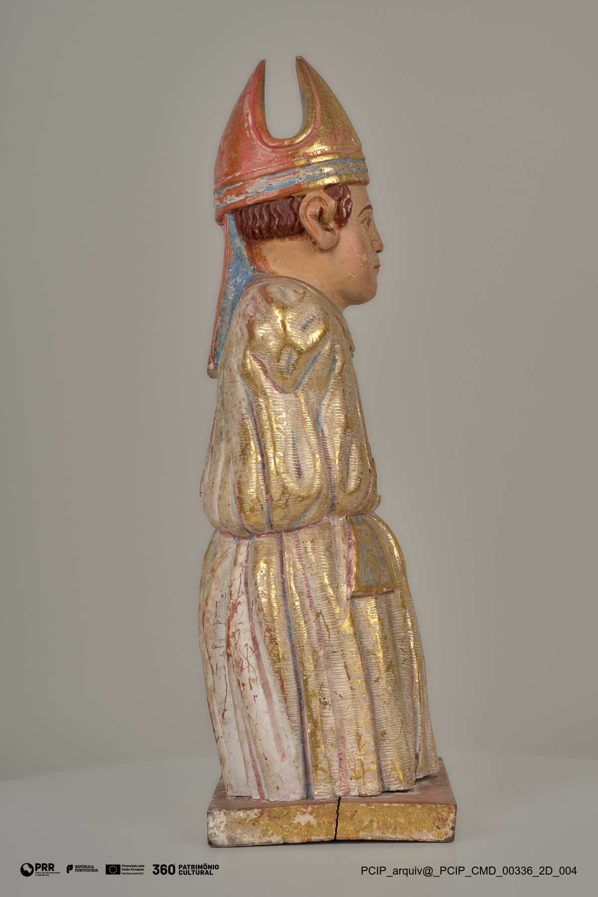 Matéria/Técnica: Madeira, pigmentos, ouro, tecido, vidro, osso.; Cronologia: 1664; Autoria: António Lopes; António de Oliveira; Dimensões: Altura: 48 cm; Largura: 18 cm; Profundidade: 14 cm.