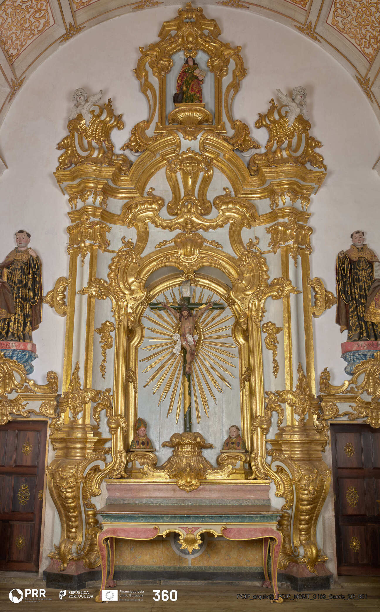 Matéria/Técnica: Madeira entalhada e dourada / Entalhamento e douramento; Cronologia: 1760; Autoria: André Soares; Dimensões (cm): 885 x 380.
