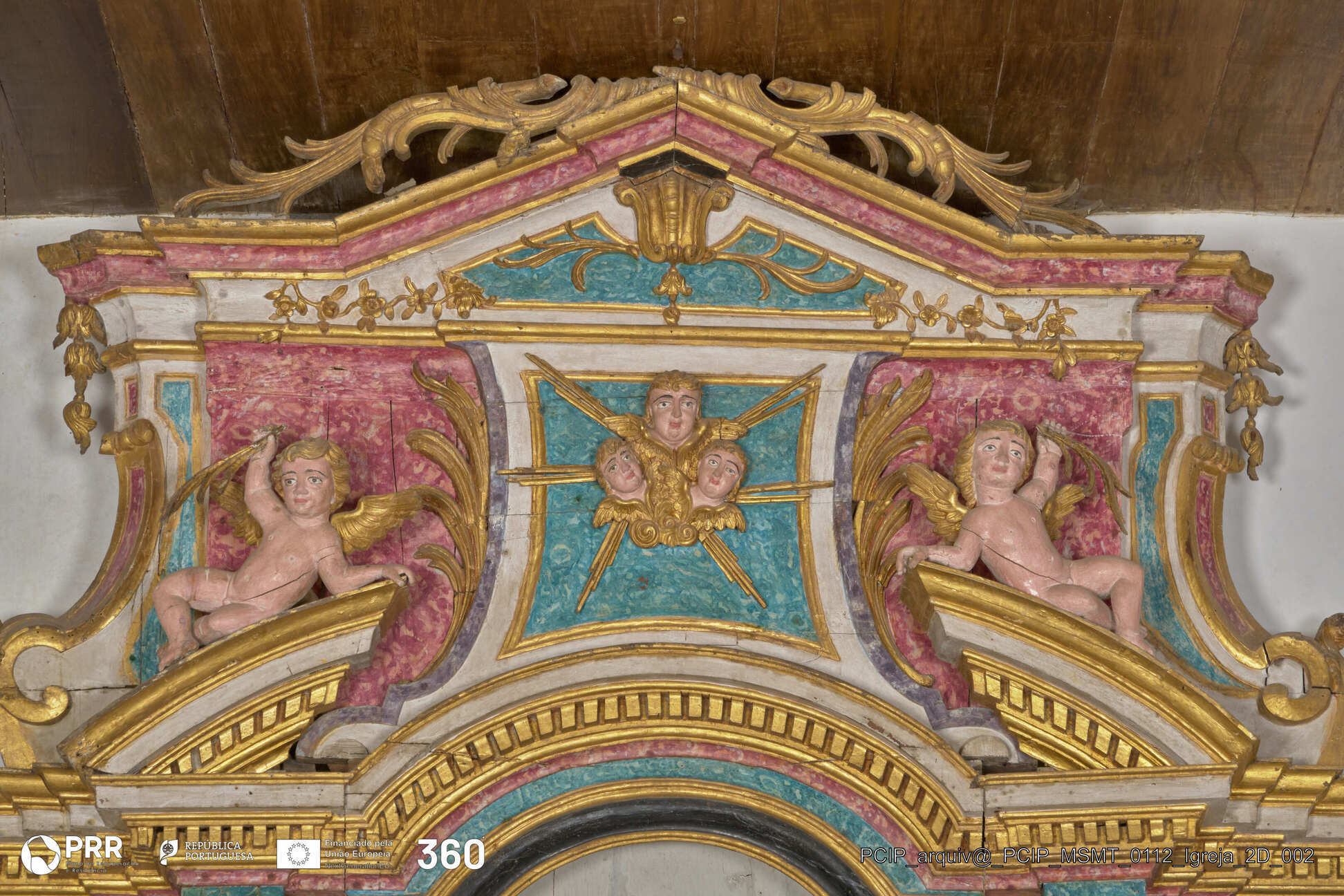 Matéria/Técnica: Madeira entalhada dourada e polícroma / Entalhamento e douramento; Cronologia: 1783-1786; Autoria: Frei José Santo António Vilaça; Dimensões (cm): 600 x 456 x 66.