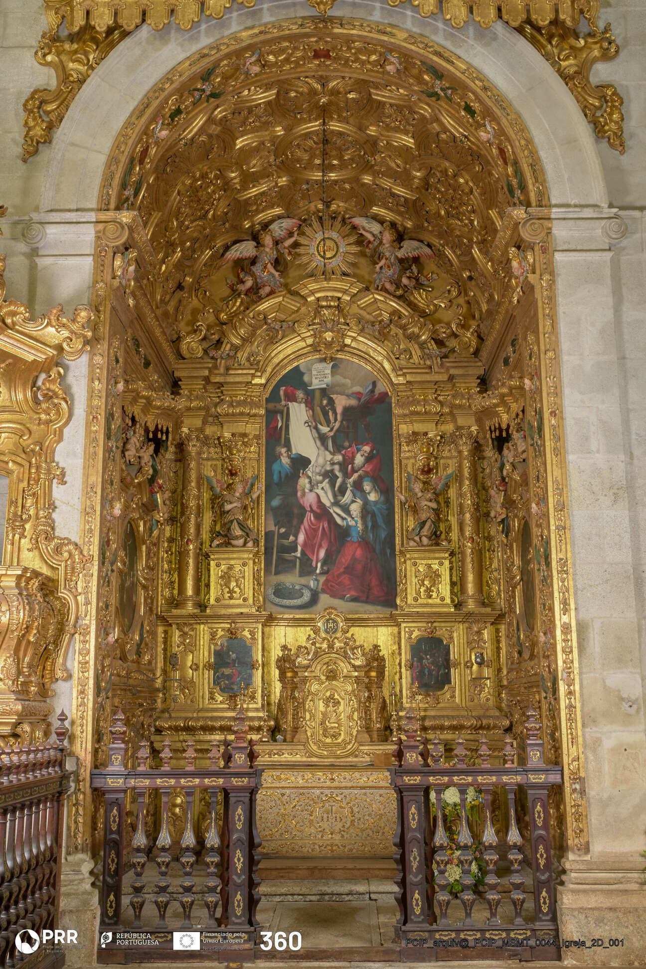Matéria/Técnica: Madeira entalhada e dourada / Entalhamento e douramento; Cronologia: 1738 - 1740; Autoria: António Fernandes Palmeira; Dimensões (cm): 800 x 443 x127.