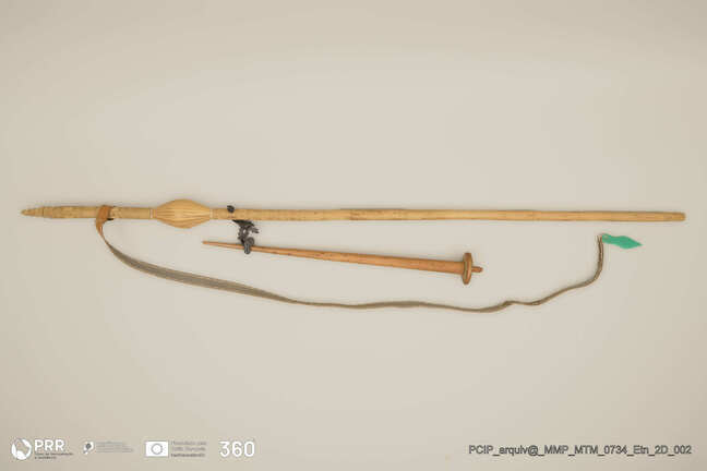 Matéria/Técnica: Desconhecida; Cronologia: Século XX; Autoria: Desconhecida; Dimensões (cm): Altura: roca- 100 cm, o fuso - 43 cm x Diâmetro: roquil- 14 cm.