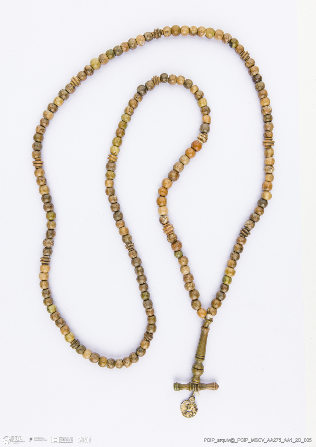 Matéria/Técnica: Osso; Cronologia: Século XVI -XVII; Autoria: Desconhecida; Dimensões: Dimensões: a) Diâmetro médio: 5mm; Diâmetro médio do orifício: 2mm; b) Diâmetro médio: 5mm; Altura média: 5mm, Diâmetro médio do orifício: 2mm; c) comprimento: 30mm; Diâmetro médio do orifício: 2mm; d) comprimento: 23mm; Diâmetro médio do orifício: 2mm; e) comprimento: 6mm; Diâmetro médio do orifício: 2mm.