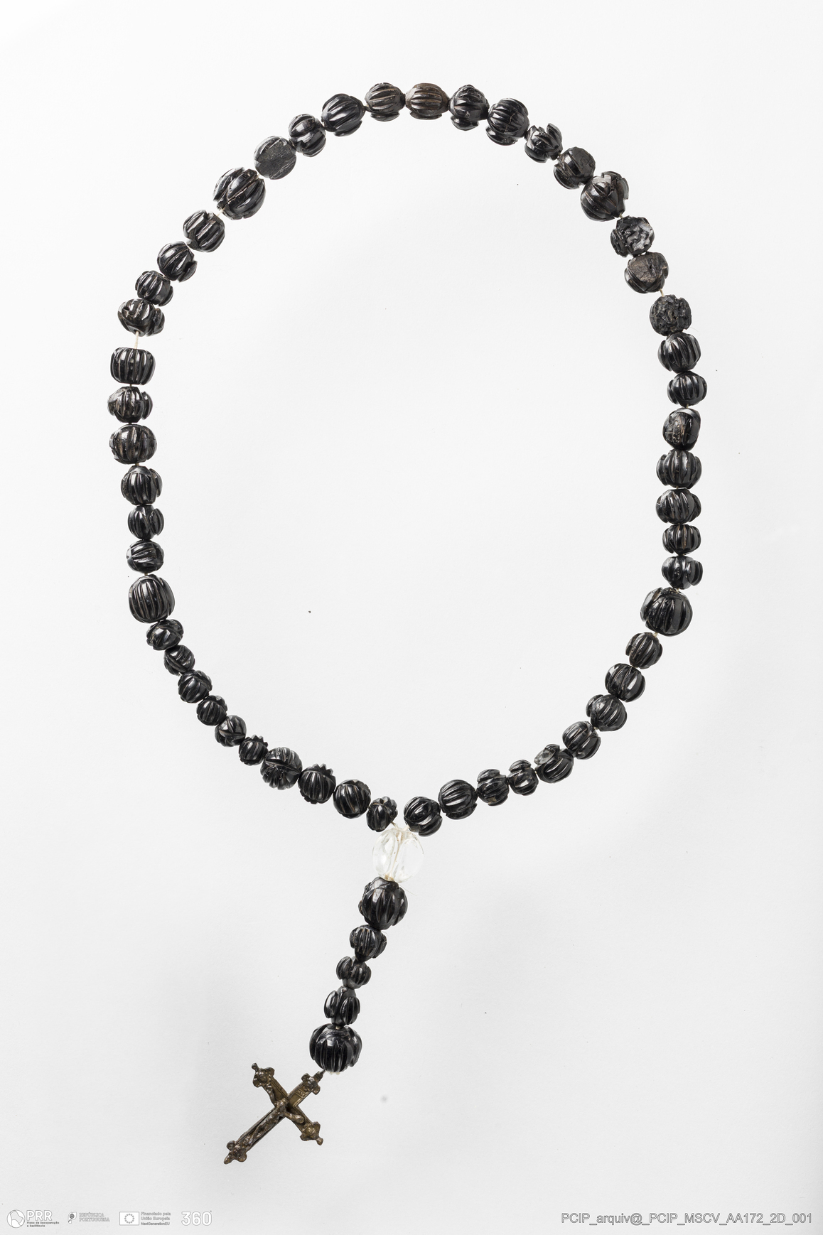 Matéria/Técnica: Azeviche, cristal de rocha e metal; Cronologia: Século XVI-XVII; Autoria: Desconhecida; Dimensões: Comprimento do rosário: 485mm; Diâmetro de uma conta: 18mm; AA239 - Diâmetro: 19mm; AA405 - Comprimento: 50mm; Largura: 34mm; Espessura: 2mm.