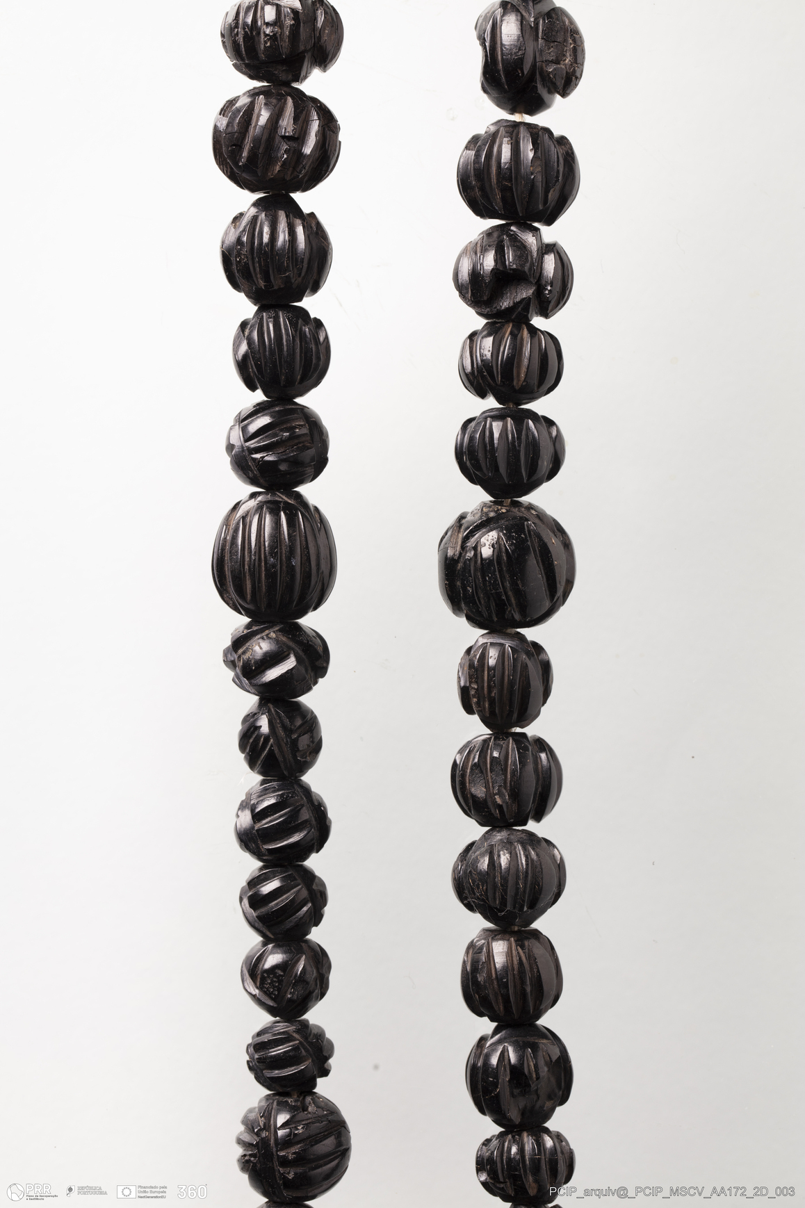 Matéria/Técnica: Azeviche, cristal de rocha e metal; Cronologia: Século XVI-XVII; Autoria: Desconhecida; Dimensões: Comprimento do rosário: 485mm; Diâmetro de uma conta: 18mm; AA239 - Diâmetro: 19mm; AA405 - Comprimento: 50mm; Largura: 34mm; Espessura: 2mm.