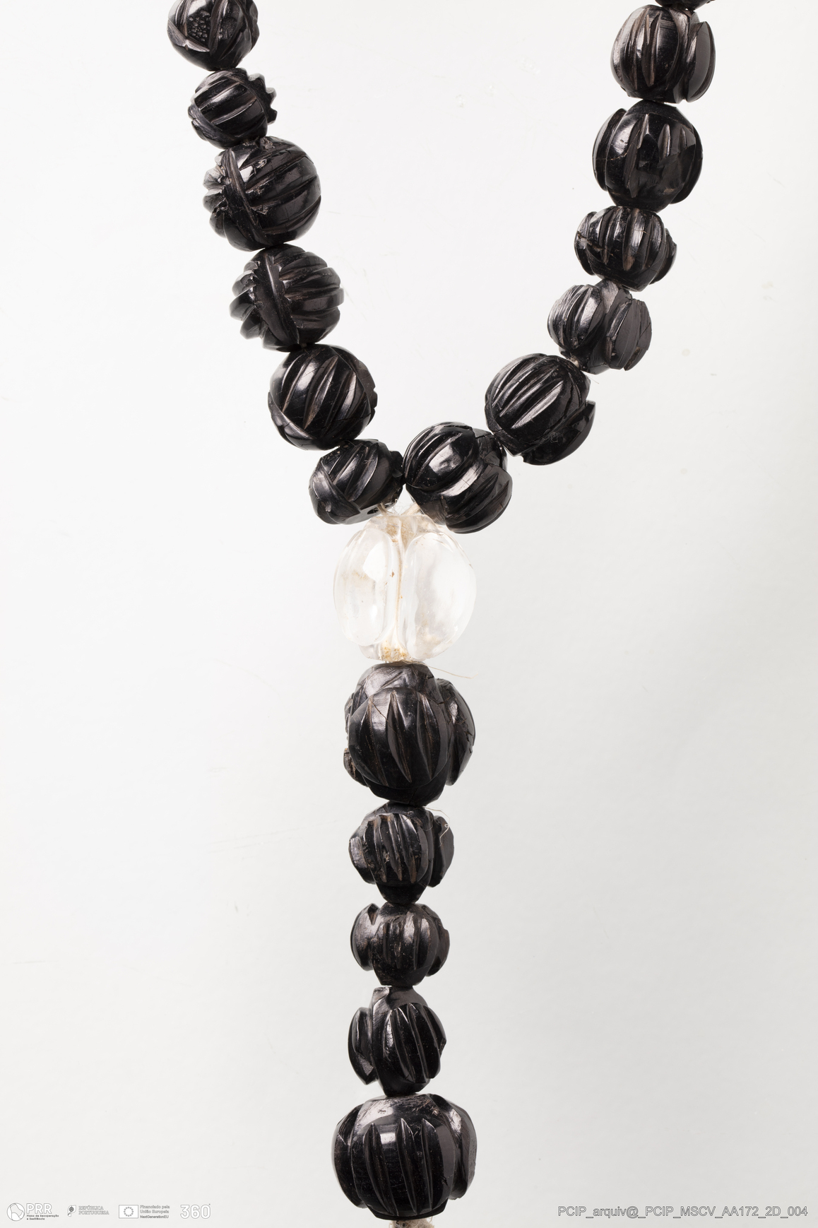 Matéria/Técnica: Azeviche, cristal de rocha e metal; Cronologia: Século XVI-XVII; Autoria: Desconhecida; Dimensões: Comprimento do rosário: 485mm; Diâmetro de uma conta: 18mm; AA239 - Diâmetro: 19mm; AA405 - Comprimento: 50mm; Largura: 34mm; Espessura: 2mm.