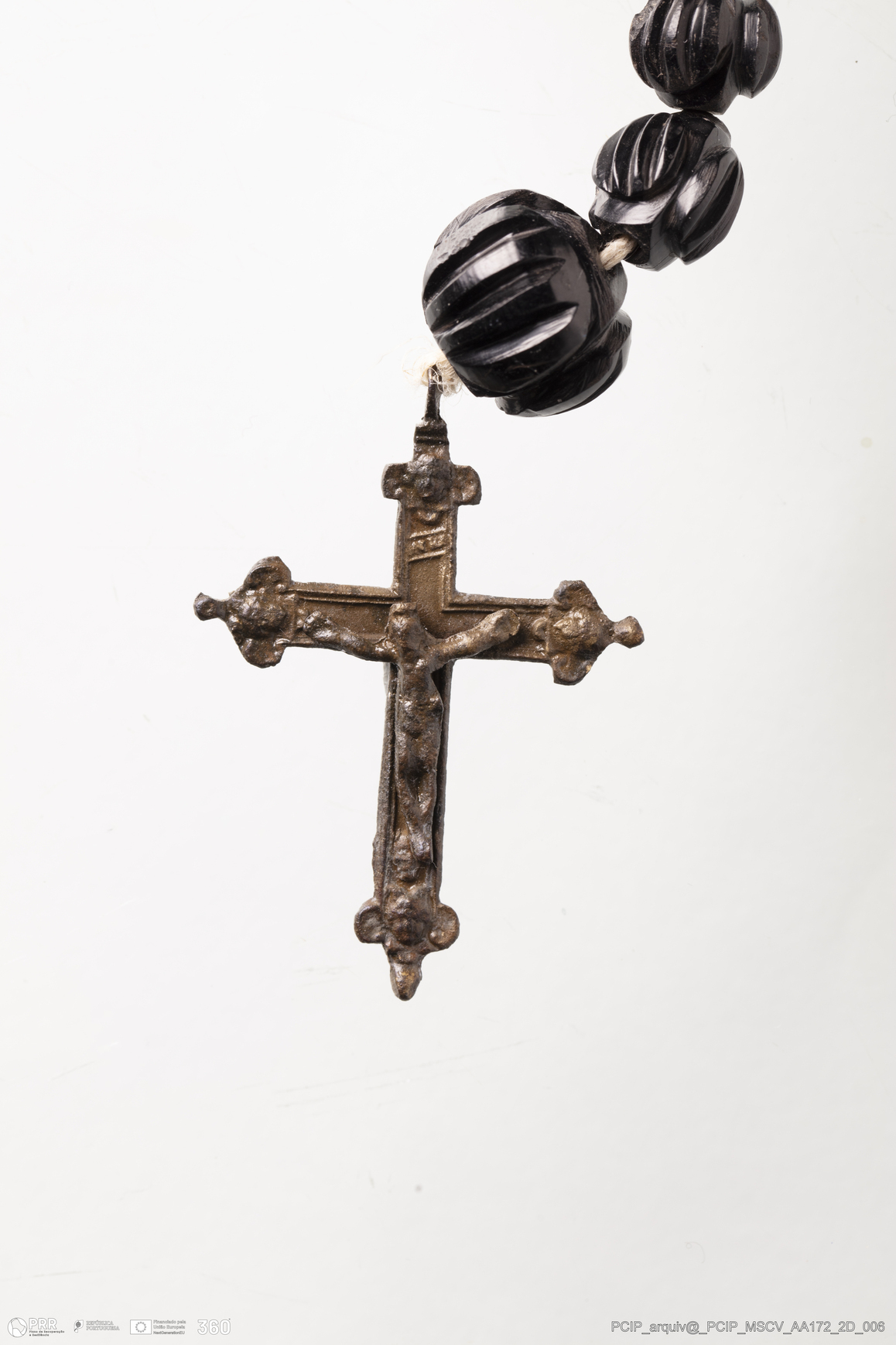 Matéria/Técnica: Azeviche, cristal de rocha e metal; Cronologia: Século XVI-XVII; Autoria: Desconhecida; Dimensões: Comprimento do rosário: 485mm; Diâmetro de uma conta: 18mm; AA239 - Diâmetro: 19mm; AA405 - Comprimento: 50mm; Largura: 34mm; Espessura: 2mm.