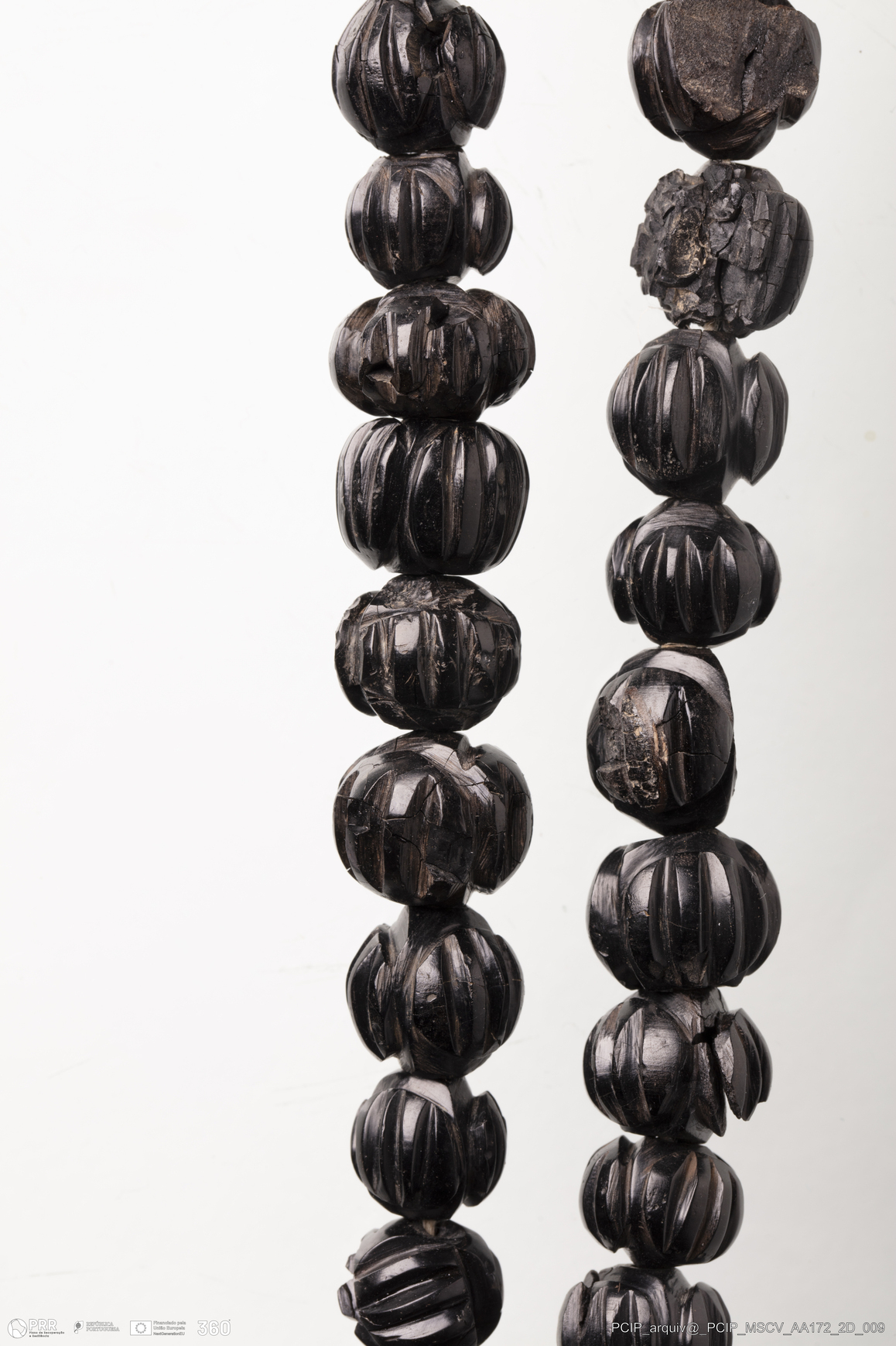 Matéria/Técnica: Azeviche, cristal de rocha e metal; Cronologia: Século XVI-XVII; Autoria: Desconhecida; Dimensões: Comprimento do rosário: 485mm; Diâmetro de uma conta: 18mm; AA239 - Diâmetro: 19mm; AA405 - Comprimento: 50mm; Largura: 34mm; Espessura: 2mm.