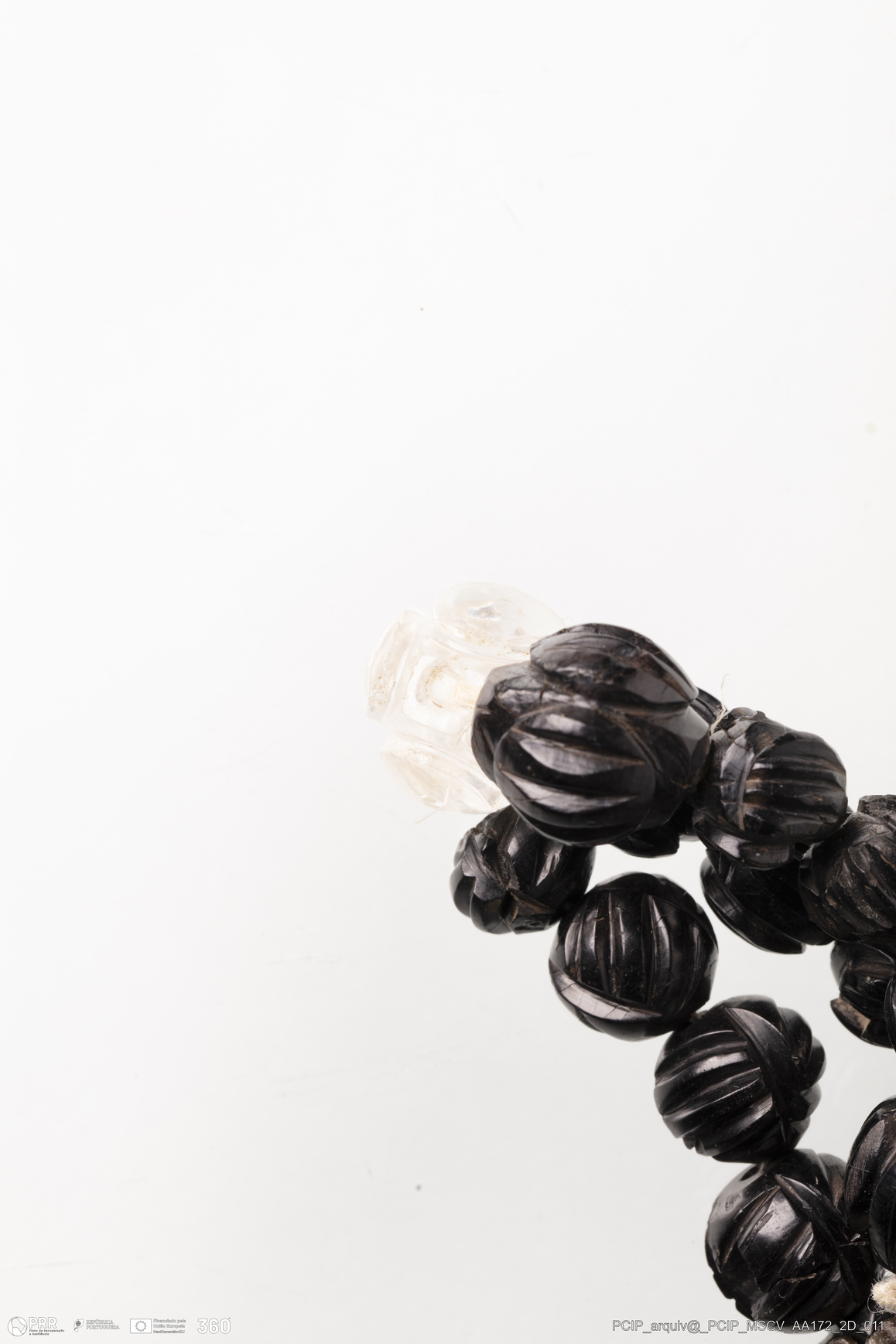 Matéria/Técnica: Azeviche, cristal de rocha e metal; Cronologia: Século XVI-XVII; Autoria: Desconhecida; Dimensões: Comprimento do rosário: 485mm; Diâmetro de uma conta: 18mm; AA239 - Diâmetro: 19mm; AA405 - Comprimento: 50mm; Largura: 34mm; Espessura: 2mm.
