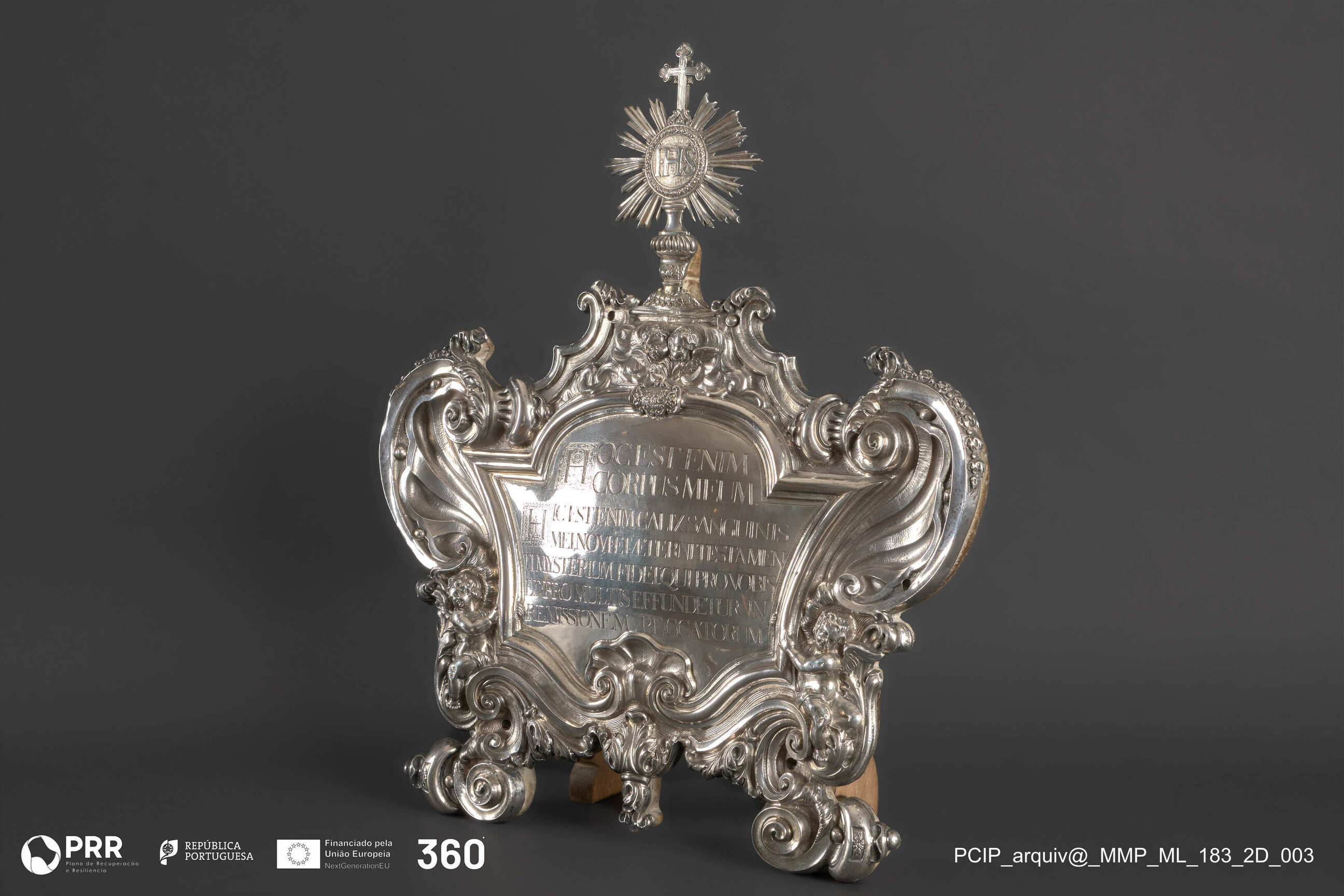 Matéria/Técnica: Prata dourada, relevada, incisa e recortada; Cronologia: 1751-1800; Autoria: Desconhecida; Dimensões (cm): Altura: 57,8 x Largura: 50,5.