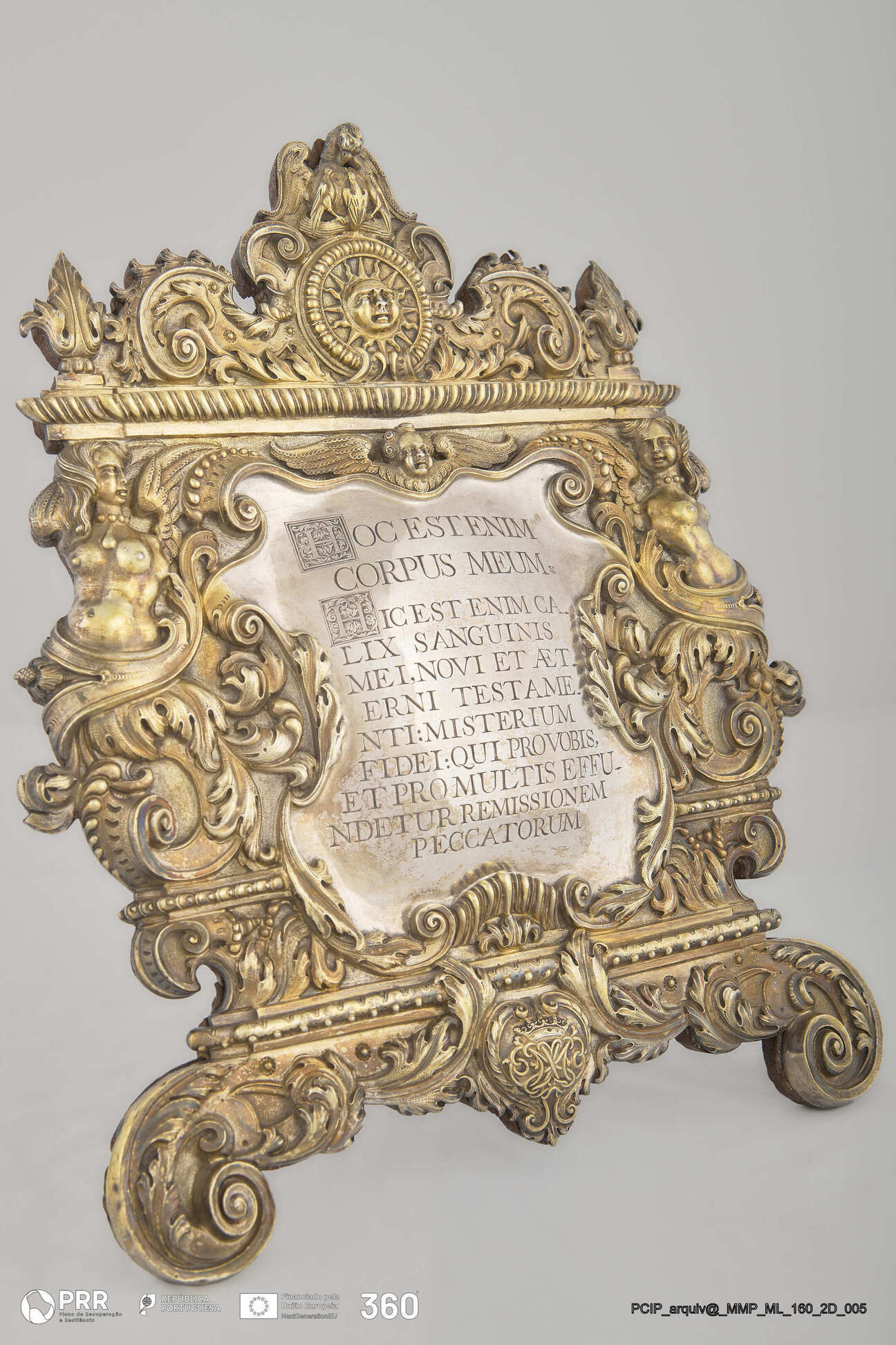 Matéria/Técnica: Branca, dourada, relevada e cinzelada; Cronologia: Desconhecida; Autoria: TC (Tomás Correia); Dimensões: Desconhecidas.