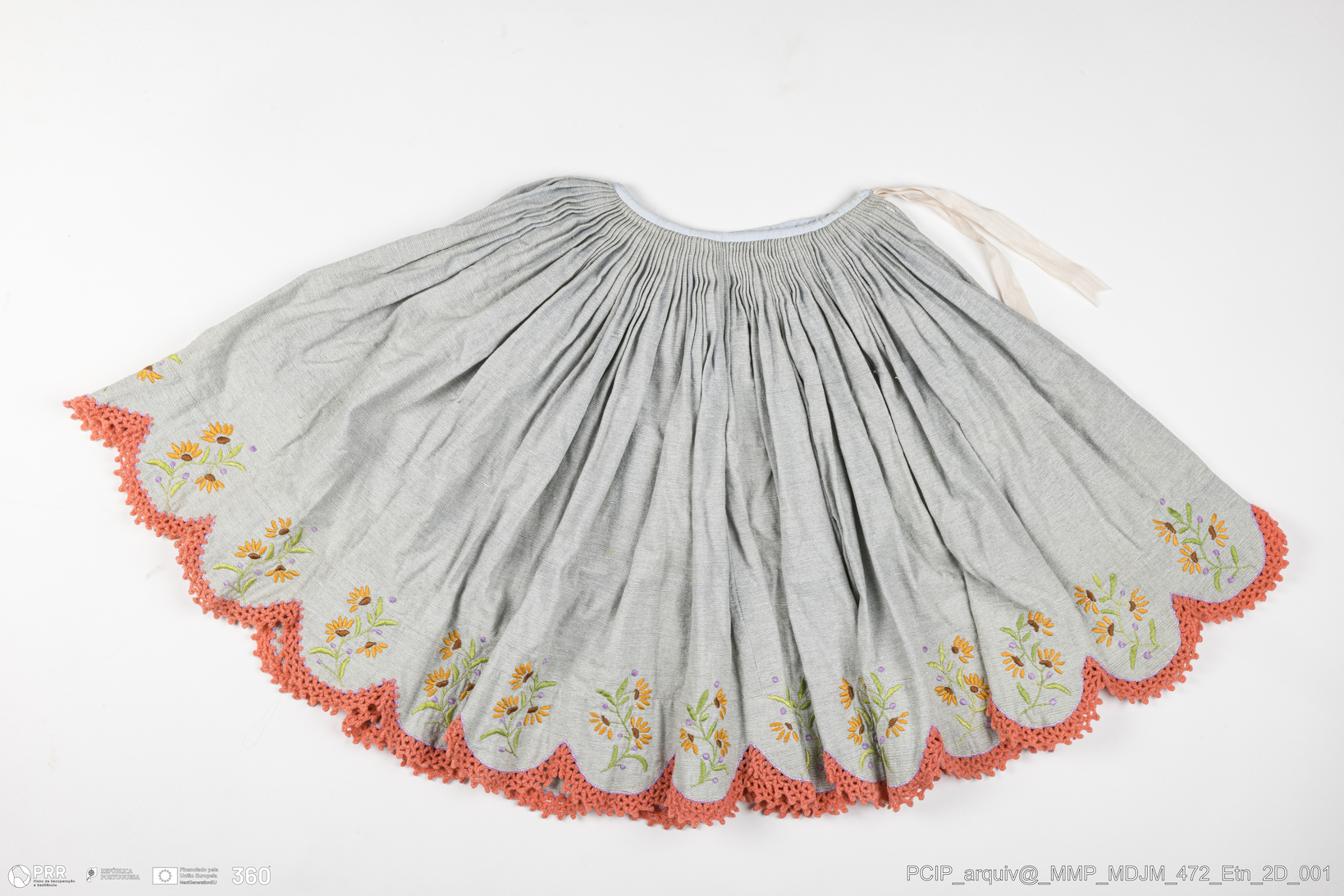 Matéria/Técnica: Tecido de algodão cinzento e branco; Cronologia: 1936; Autoria: Desconhecida; Dimensões: Altura: 67 cm x Roda: 400 cm.