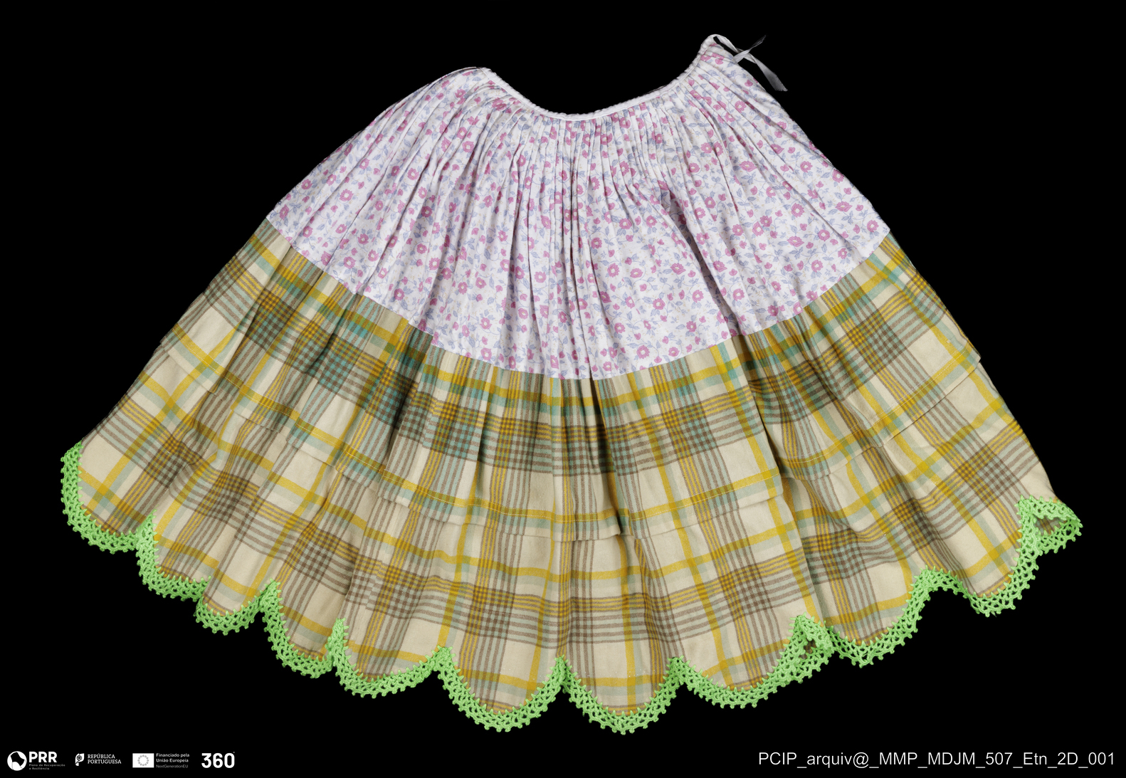 Matéria/Técnica: Tecido de lã grossa - escocês; Cronologia: Séc. XX; Autoria: Desconhecida; Dimensões: Altura: 59 cm x Roda: 285 cm.