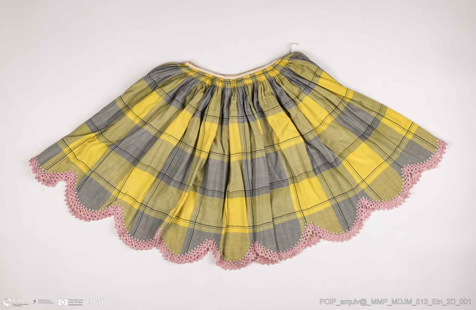 Matéria/Técnica: Lã fina (caxemira); Cronologia: Séc. XX; Autoria: Desconhecida; Dimensões: Altura: 61 cm x Roda: 352 cm.