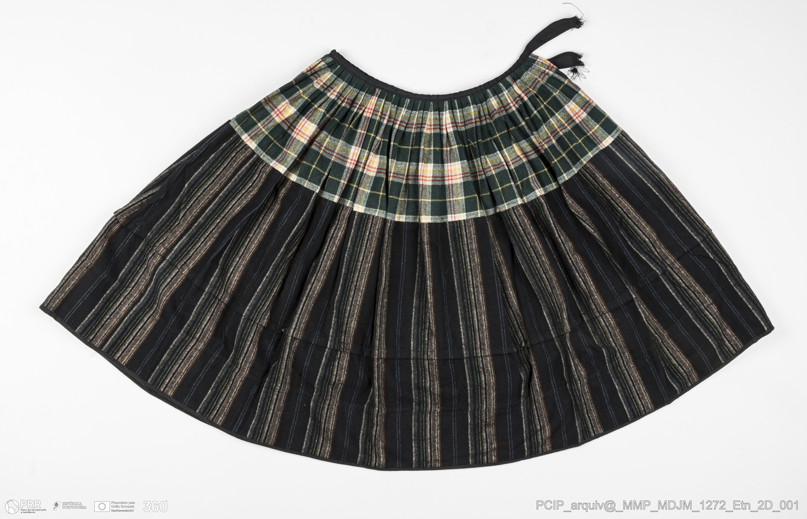 Matéria/Técnica: Lã (escocês e castorina); algodão; Cronologia: Séc. XX; Autoria: Desconhecida; Dimensões: Altura: 68 cm x Roda: 290 cm.