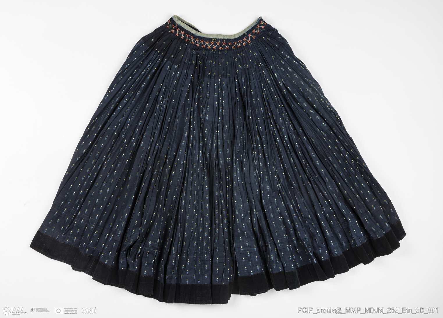 Matéria/Técnica: Chita azul; Cronologia: 1934; Autoria: Desconhecida; Dimensões: Altura: 84 cm x Roda: 505 cm.